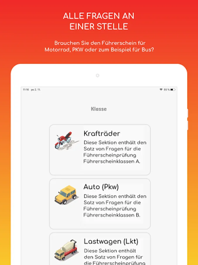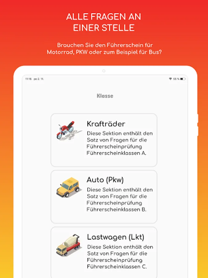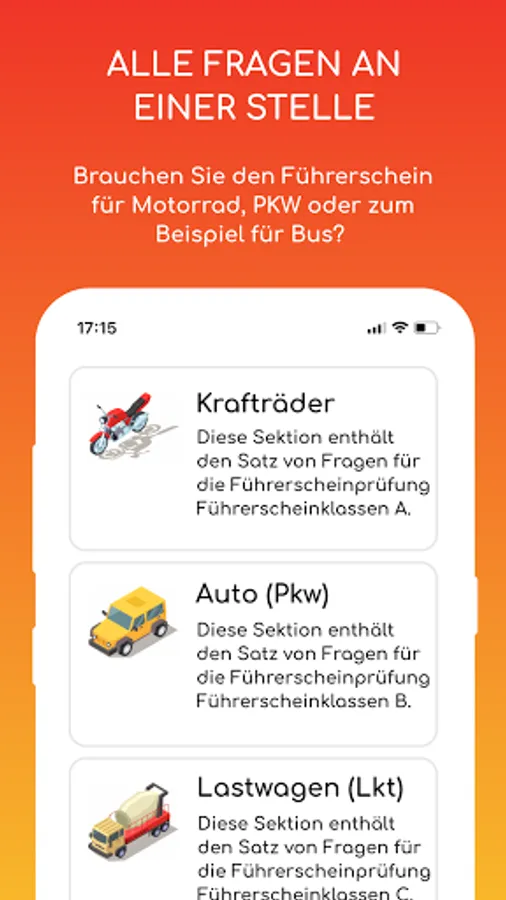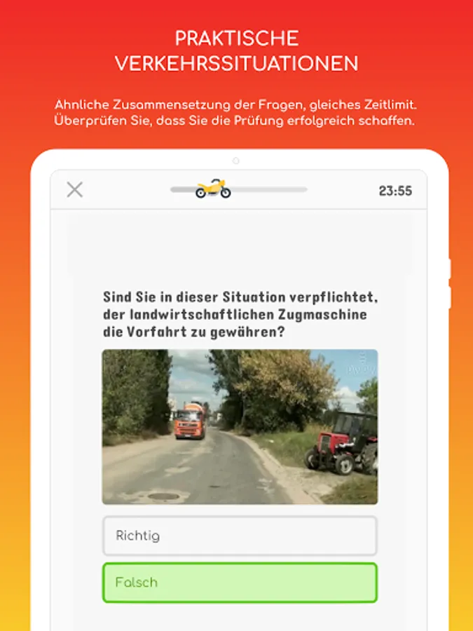 The most advanced learning application to prepare for the driver's license certificate. The application offers questions that are similar to those that you may encounter during the final driver's license test (TÜV Dekra) and is supplemented by a massive amount of real-world traffic situations. 🚗 🏍 🚌 🚛