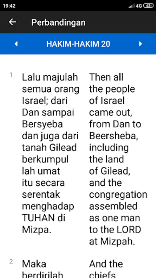 The advantages of this Multi-Language Bible Application, users can compare the translation of two languages verse by verse of God's Word, so that it can be a reference for better.
