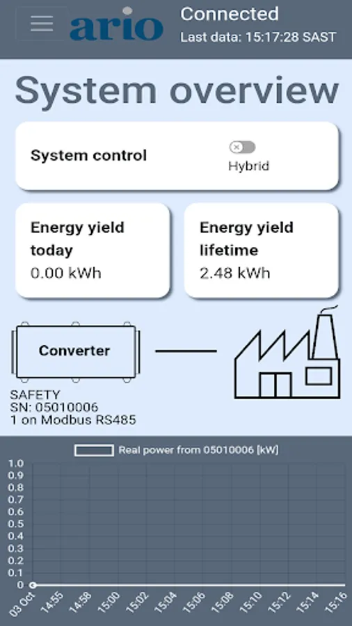 MetaWeb allows the user to monitor the system and units, such as an Ario inverter, within the system in real-time. The user can also change settings and perform basic control functions, such as switching the system on or off, through MetaWeb.