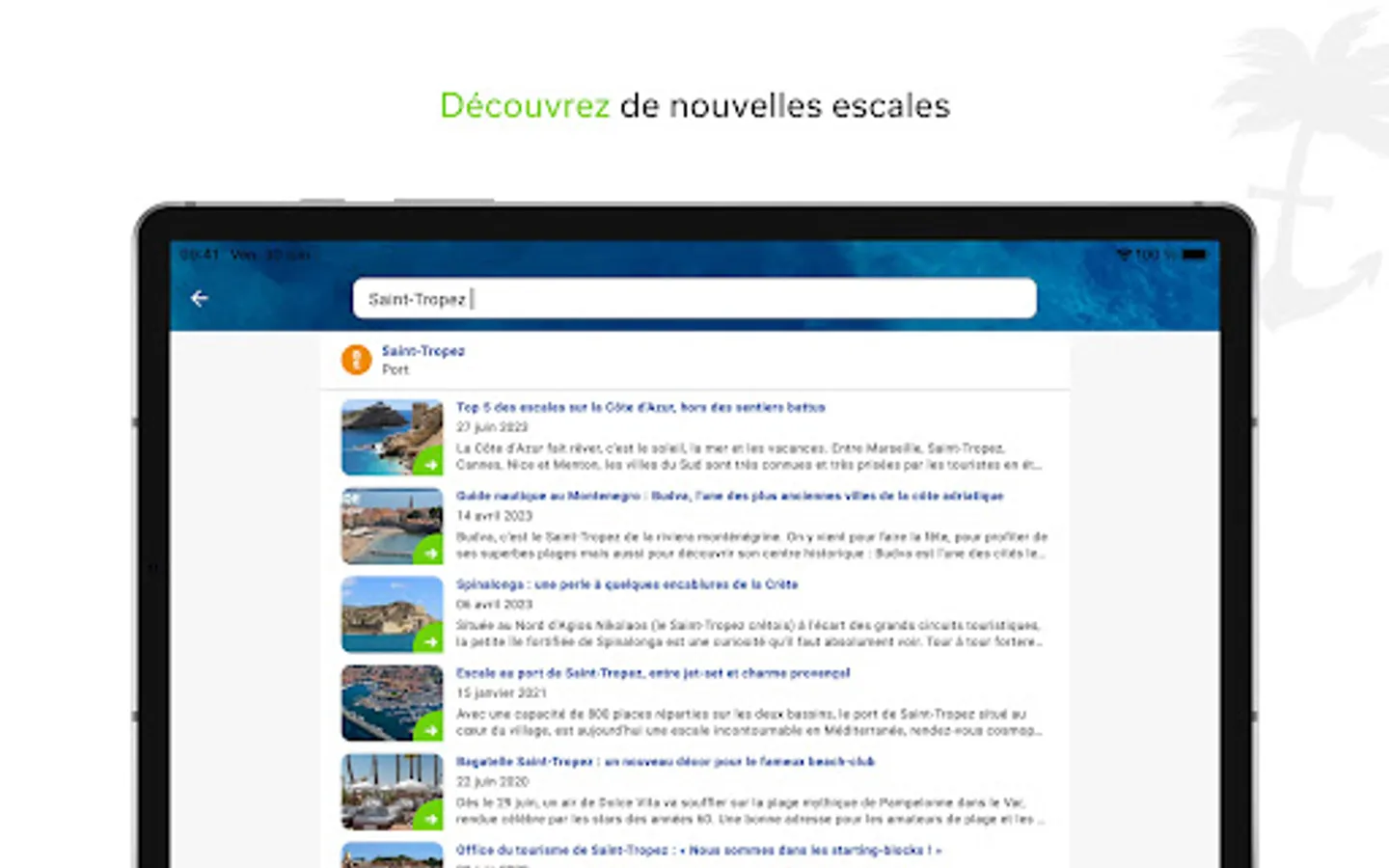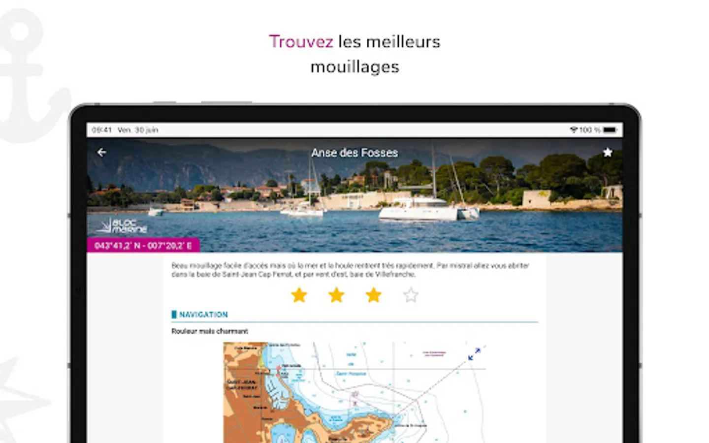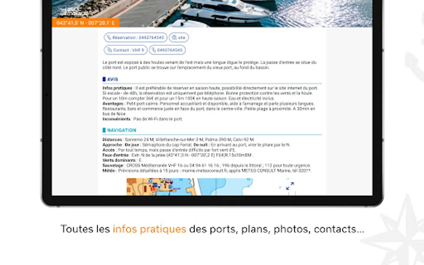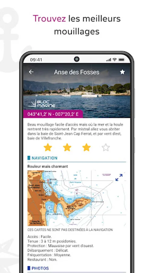 • sheets on moorings to help you choose the most suitable for you according to their characteristics: access, holding, protection, disembarkation, frequentation...