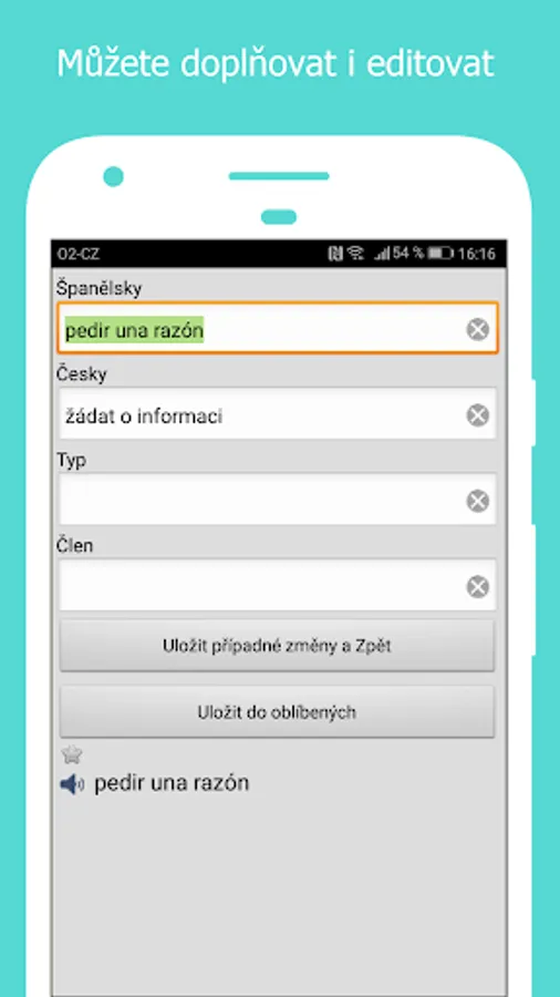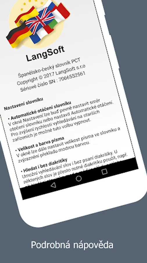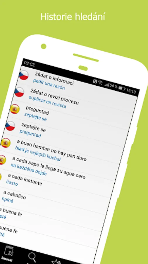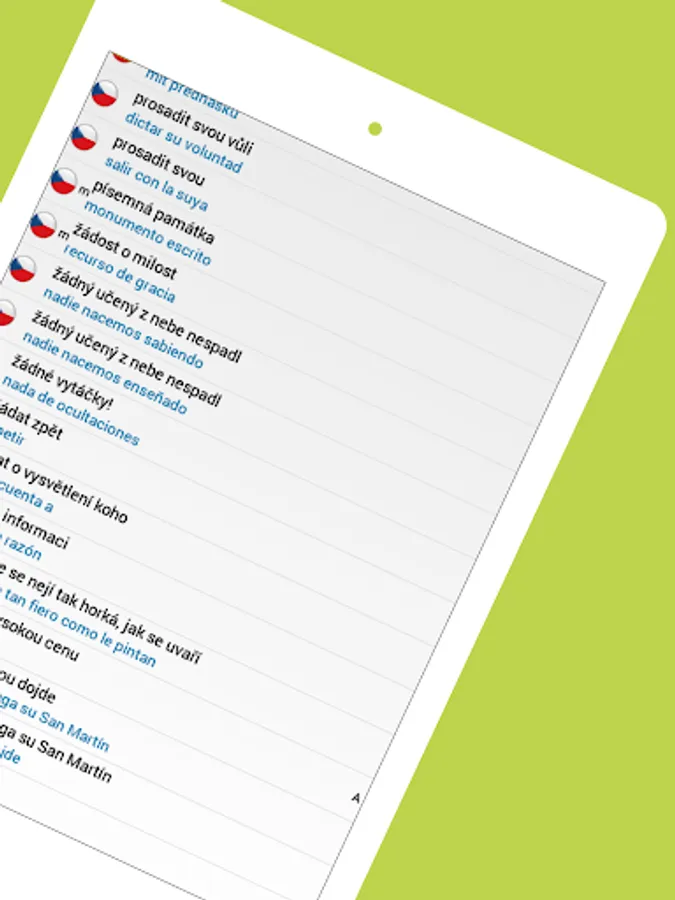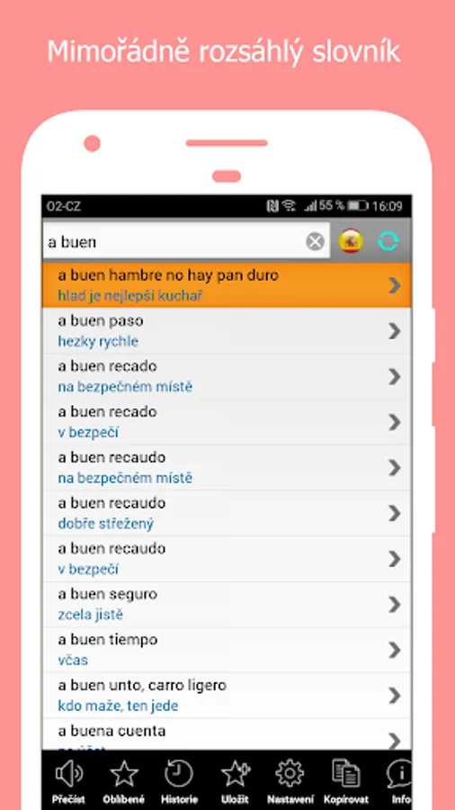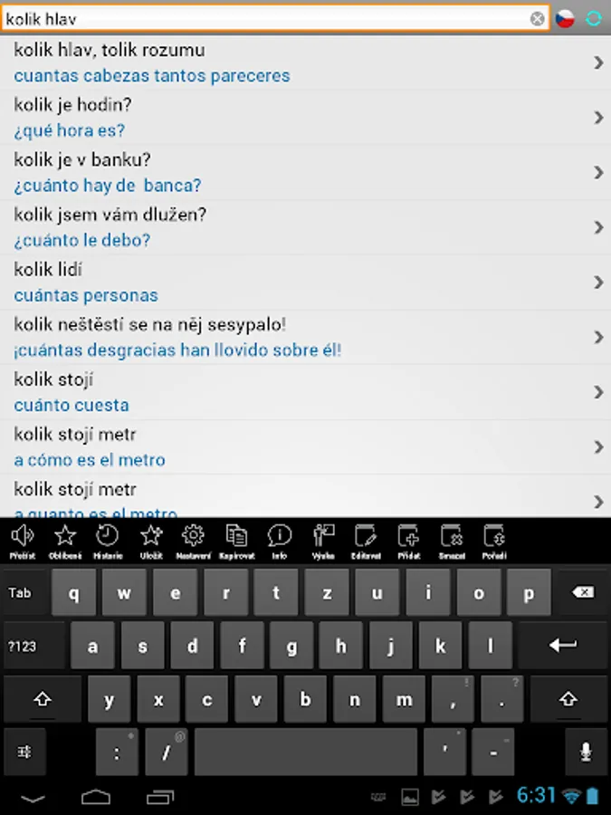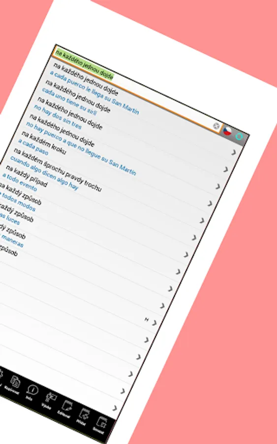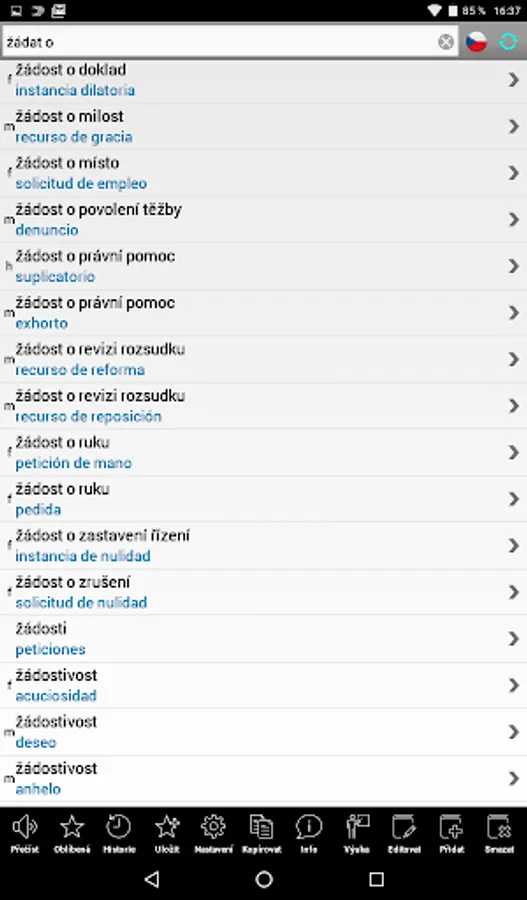 ● Allows automatic two-way search with and without accents (also with the possibility of automatic rotation, ie switching between Czech and Spanish). The results are displayed continuously, after typing the first few letters of the search word.