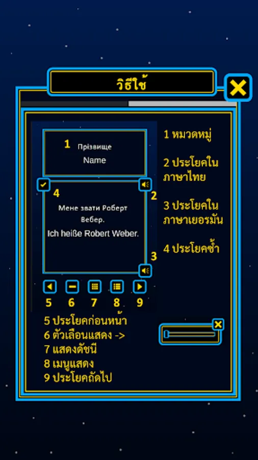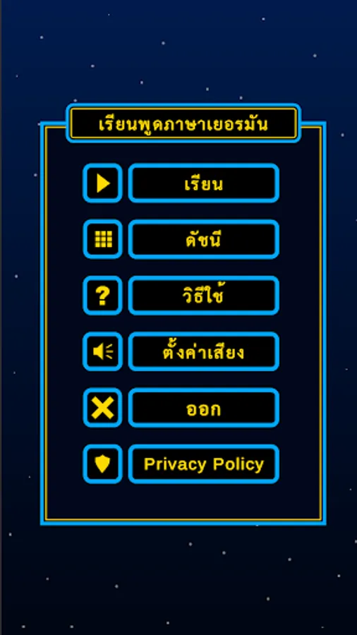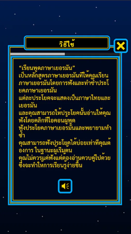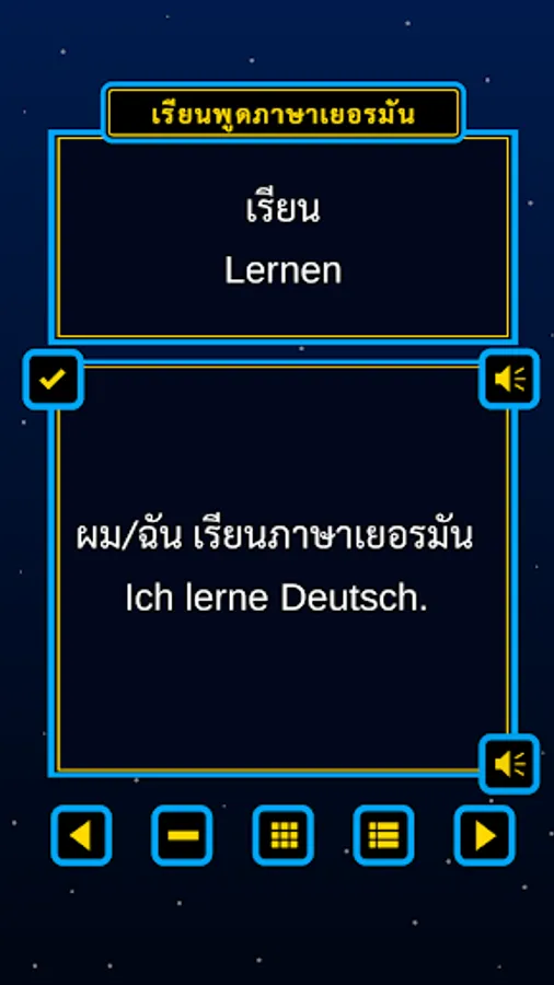 "Speak German for Thais" is a German course that enables you to learn the German language by listening to and repeating German sentences. Each sentence is displayed in Thai and German and you can have the sentence read out to you by clicking on the speaker icon. Listen to the German sentence and try to repeat it. You can listen to the sentences as often as you like. As a beginner, you should not only listen, but also read along, which makes learning easier.