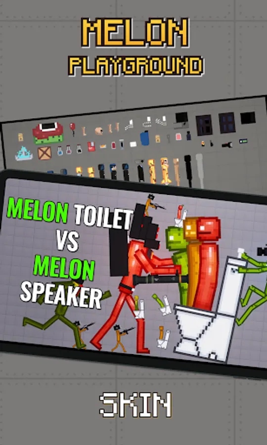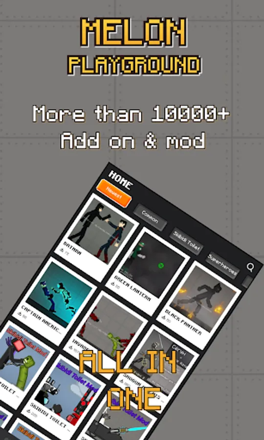 Addon Mod for Melon Playground has Skibidi Toilets, Skins, Superheroes, Maps, Weapons, Various Buildings, NPCs, Animals, Cars, Furniture, Airplanes Tanks and Technologies, Sport add-ons for Melon Playground and much more.