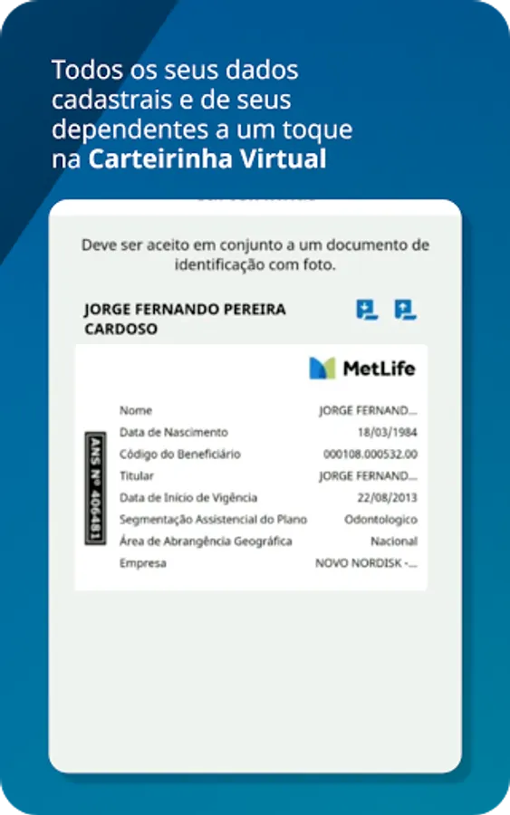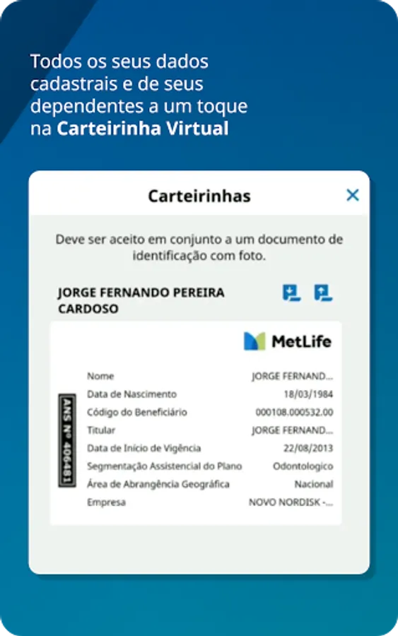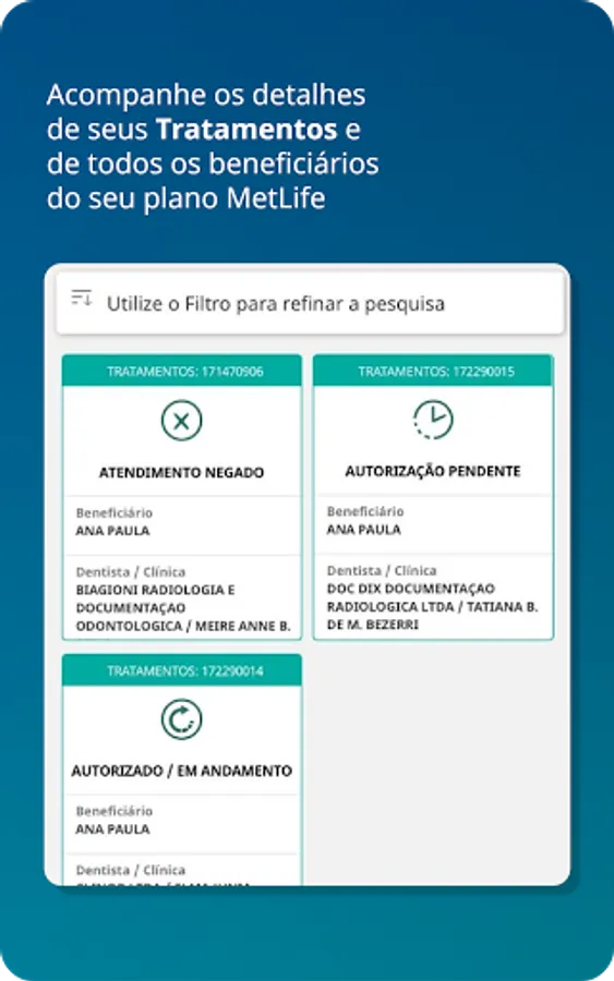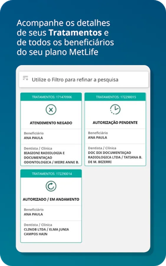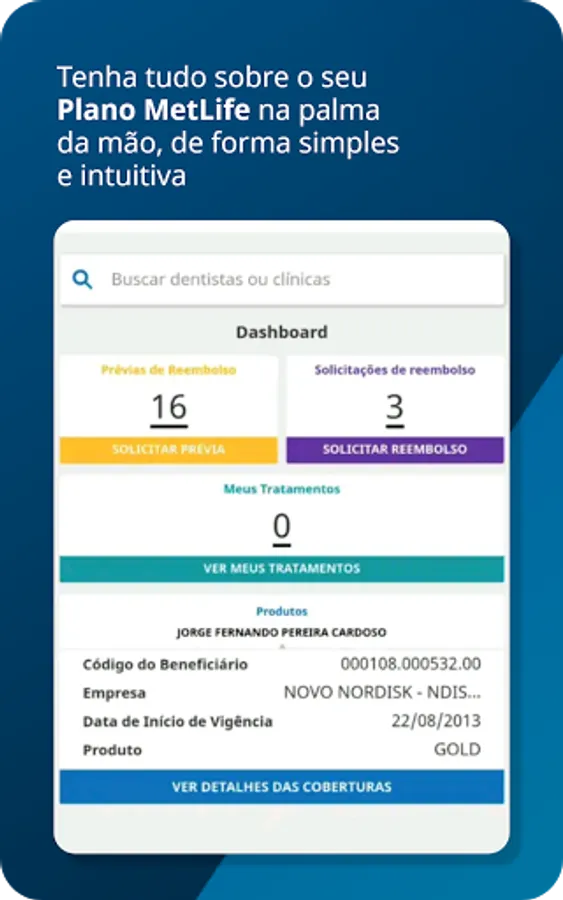 This application is intended for dental plans customers of MetLife Brazil, for collective product (Group) or individual. It offers a fast and easy way to access the information on your dental plan. Among the features are: