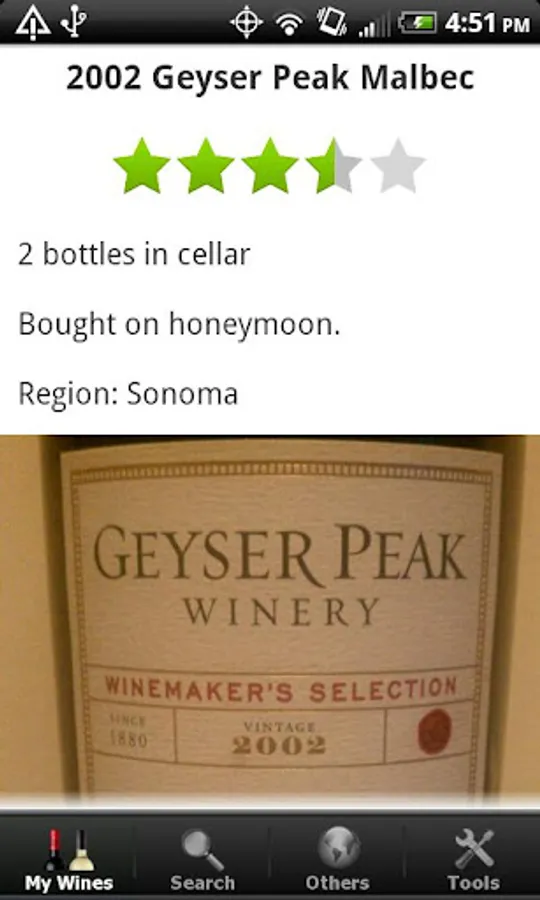 • Use the statistics tracker to monitor your wines with stats like Total Number of Wines Tracked, Average Rating, Most Number of Bottles in Cellar, Number of Wines Tracked by Varietal, Total Value of Wine Cellar, Bottles to be Drunk By Year.