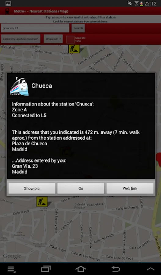 . Map that shows your location and all Metro de Madrid stations. Tapping one station, Metro+ shows you the distance between you and the selected station plus extra information, like pictures, etc... You can also enter a postal address or POI and the distance would be calculated between this entered location and the station. Optional: Metro+ can alert you with notifications of proximity alerts using vibration, LED and text notification when you approach the station (100 m.) or go away from this radious.