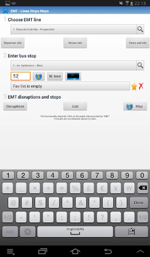 . List that shows the nearest bus stops from your location (3 km.) + info of every stop.