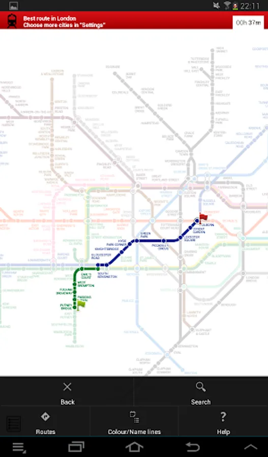The best route is calculated on the Metro plan tapping both stations (start and destination) or selecting them from the menu "Route". This section has got its own favourites and the best route can also be viewed on a list.