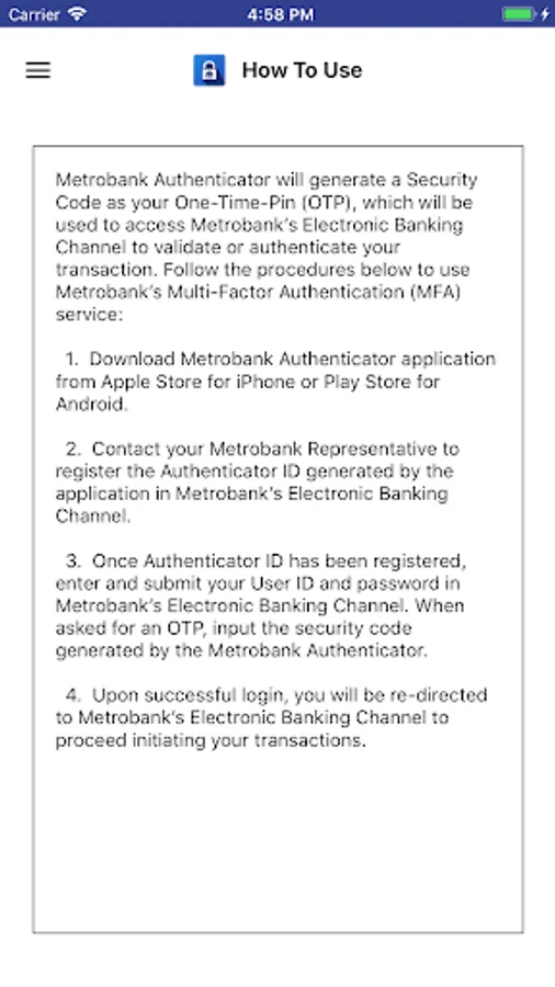 Metrobank Authenticator is a mobile application service to be used for MBTC’s e-channels for multi-factor authentication (OTP) authentication.