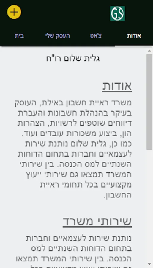 Galit Shalom owns an accounting firm in Eilat, and is mainly engaged in bookkeeping and forwarding current reports to the authorities, capital statements, execution of employees' salaries and more. Galit Shalom Accounting Eilat also provides services to self-employed persons and companies in the field of annual income tax returns. Among the firm's services you will also find professional consulting services in all areas of accounting. Galit Shalom's firm advocates reliability and personal treatment, and is committed to putting the interests of its clients above all else