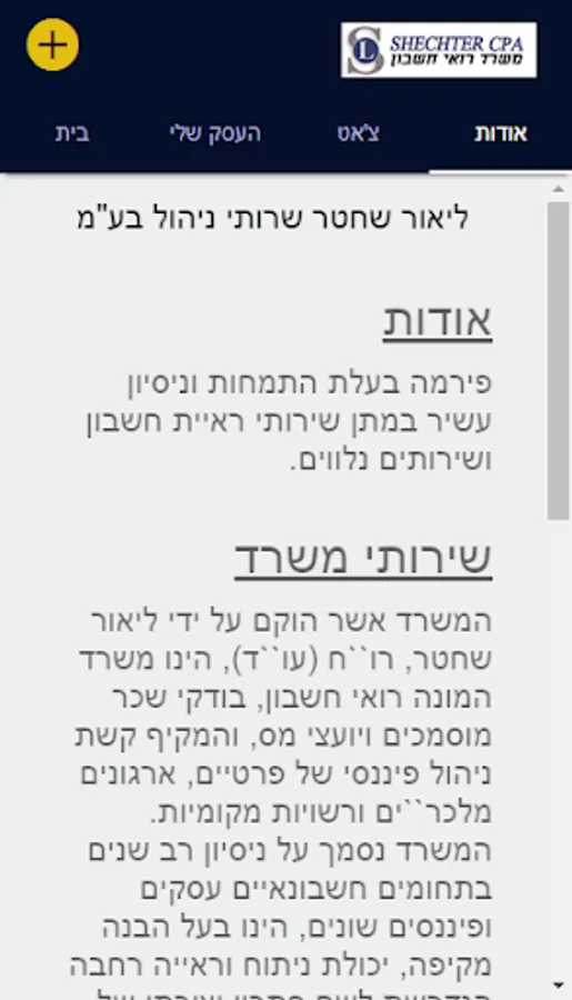 The firm that was established by Lior Shechter, CPA (attorney), is a firm that appoints accountants, qualified payroll auditors and tax consultants, and covers the spectrum of financial management of individuals, non-profit organizations and local authorities. The firm relies on many years of experience in the fields Various business and finance accountants, has a comprehensive understanding, analytical ability and broad vision required for a creative solution of broad problems according to the client's needs in each and every case.