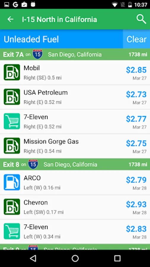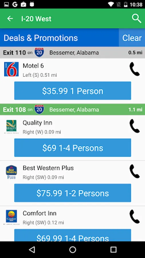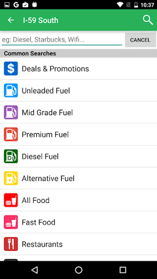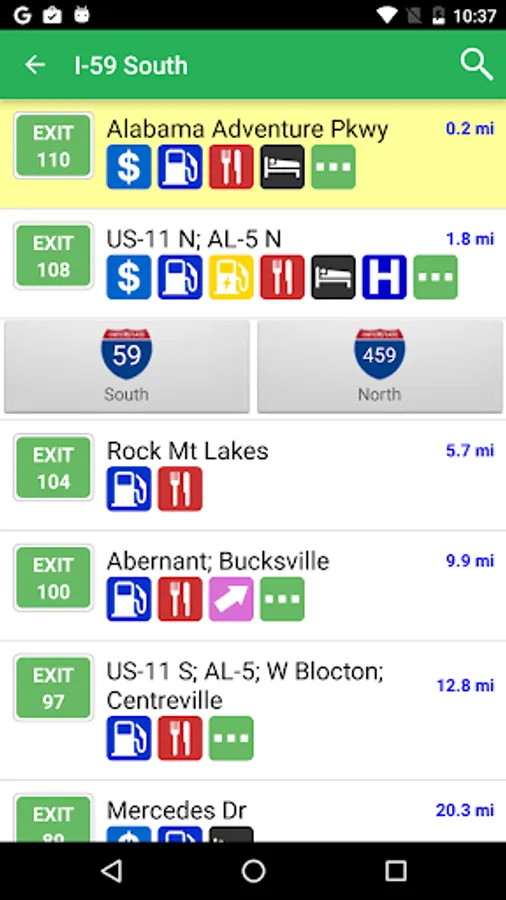 iExit Search is powerful and dead simple. Search the next 100 exits for businesses (like Starbucks, Cracker Barrel, or KOA Campgrounds), amenities (like WiFi, Playground, or Truck Parking), rest stops, hotel deals, and much much more.