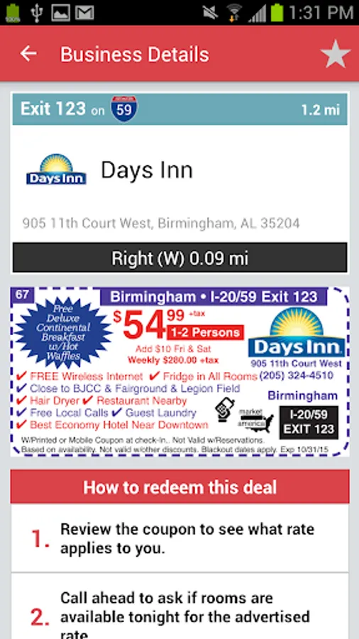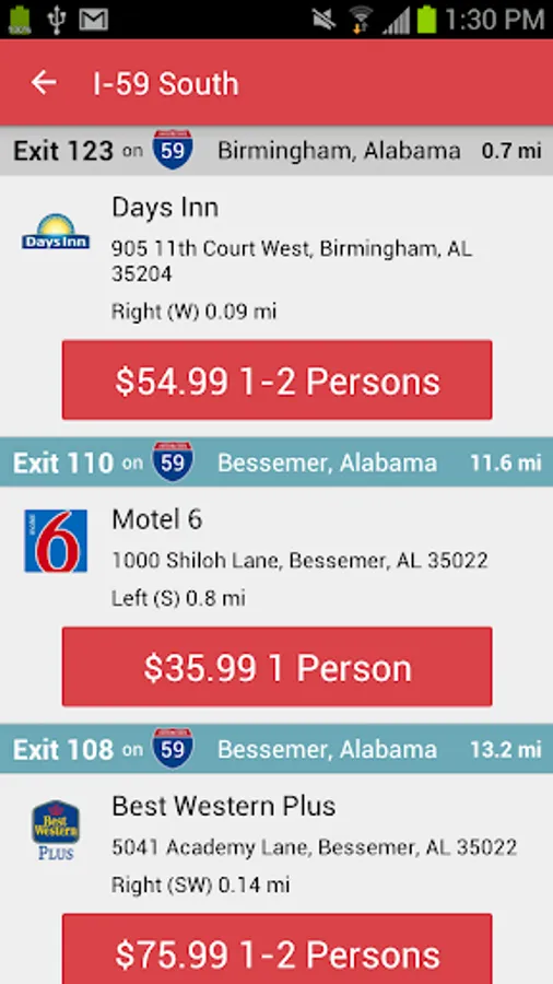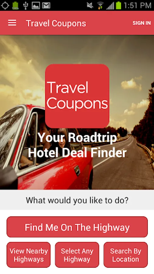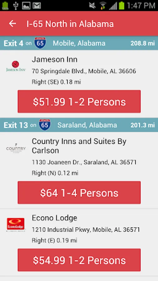 Just scroll thru the upcoming exits and decide which hotel to call and check tonight's availability, before walking in with our TravelCoupon once you arrive. Use the call button on your Android device for one touch direct connection to thousands of U.S. Hotels.