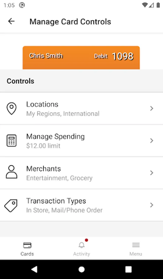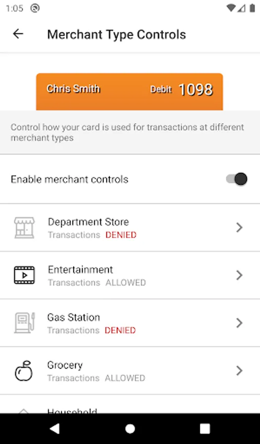 Spending limits can be established to allow transactions up to a certain dollar value and decline transactions when amounts exceed your defined thresholds. Transactions can be monitored and managed for specific merchant categories such as gas stations, department stores, restaurants entertainment, travel, and groceries. And your transactions can also be monitored for specific transaction types: in-store purchases, e-commerce transactions, mail/phone orders and ATM transactions.