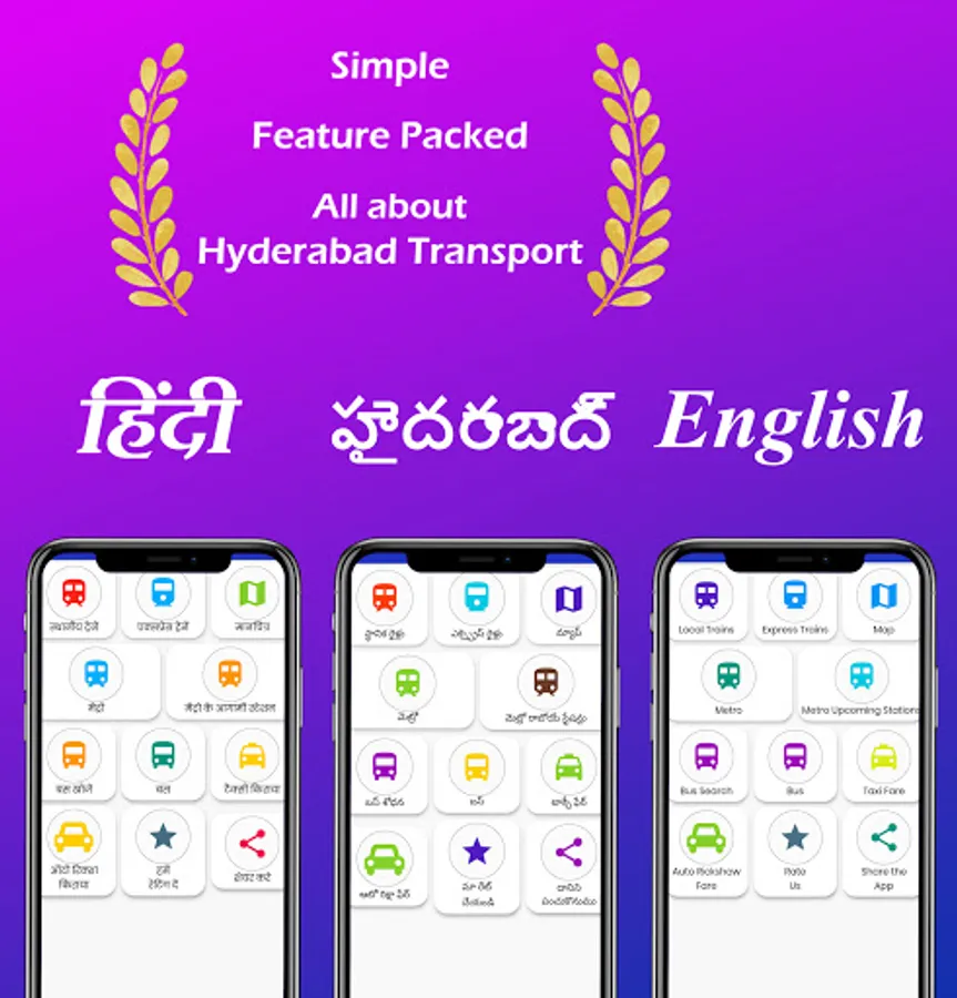 You can use this App inహైదరాబాద్, Hindi, and English languages.