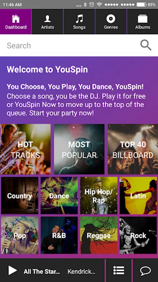 YouSpin is a socially interactive virtual jukebox application, that allows customers in YouSpin locations to vote on music, play songs, and chat with others in the bar or club. You can create your own party experience from your fingertips.