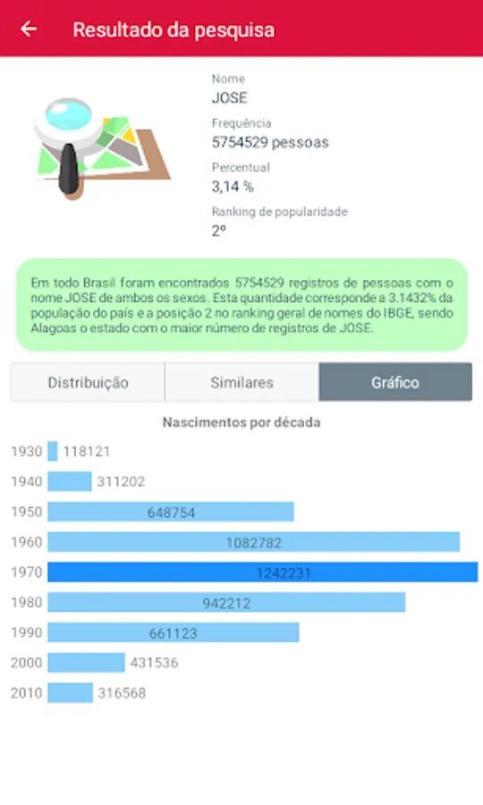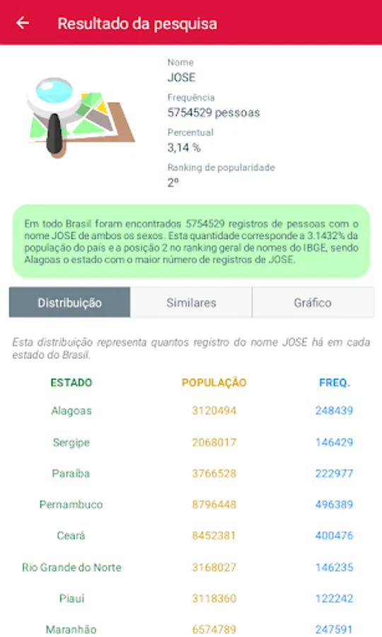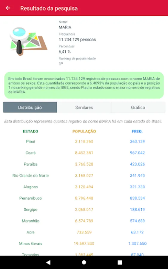 🔍 In Meu Nome Pelo Brasil, you can easily find out how many records there are of your name according to IBGE or how many "Josés", "Marias" or "Joãos" are registered in the country.