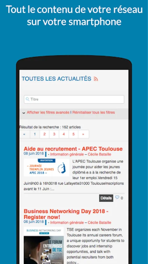 Application dedicated to the TSE Alumni network members. It gives them access to news, events, member profile, graduates and students directories, internships and job offers.