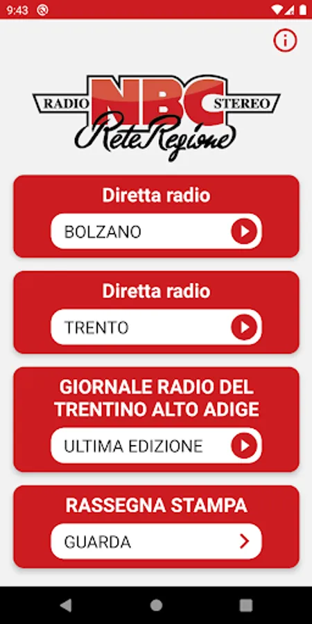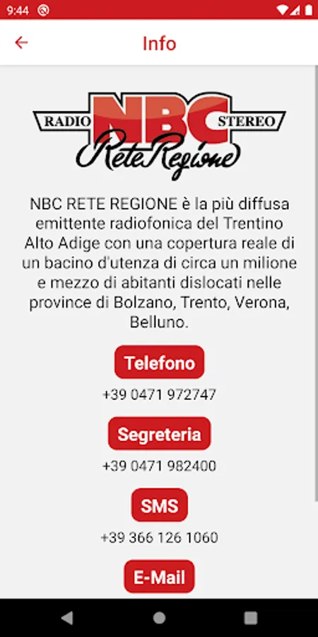 NBC NETWORK REGION is the most popular radio station in the Trentino Alto Adige with a real coverage of a catchment area of about a million and a half people in the provinces of Bolzano, Trento, Verona, Belluno (including Cortina d'Ampezzo and places in particular tourist value as the valley Zoldana) and in the area of Innsbruck in the Austrian Tyrol