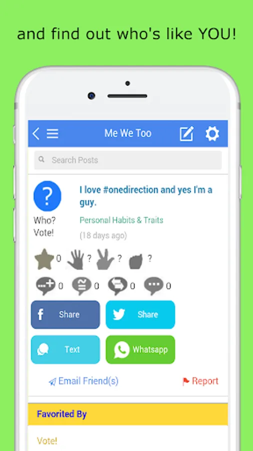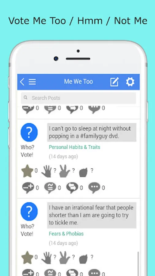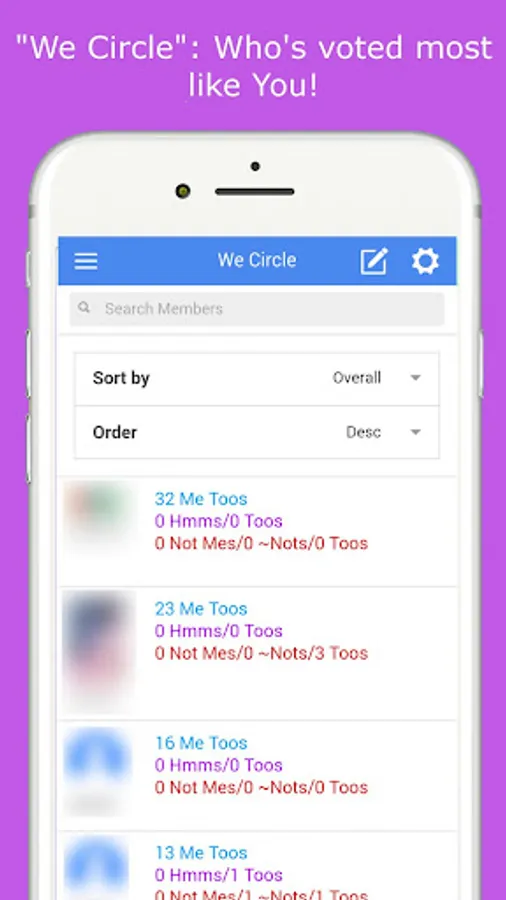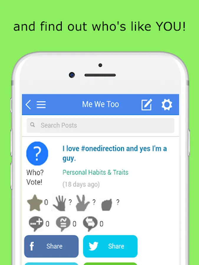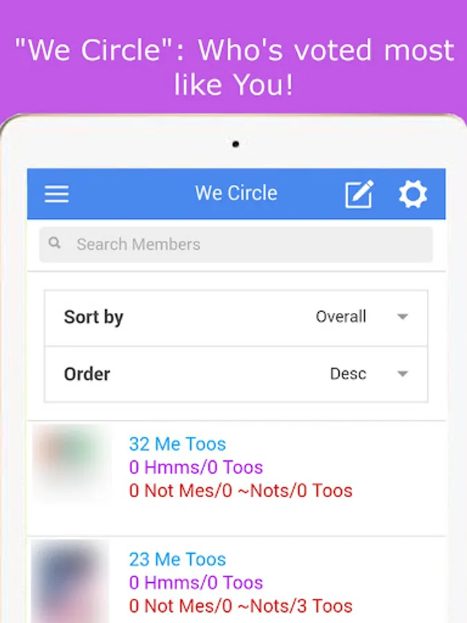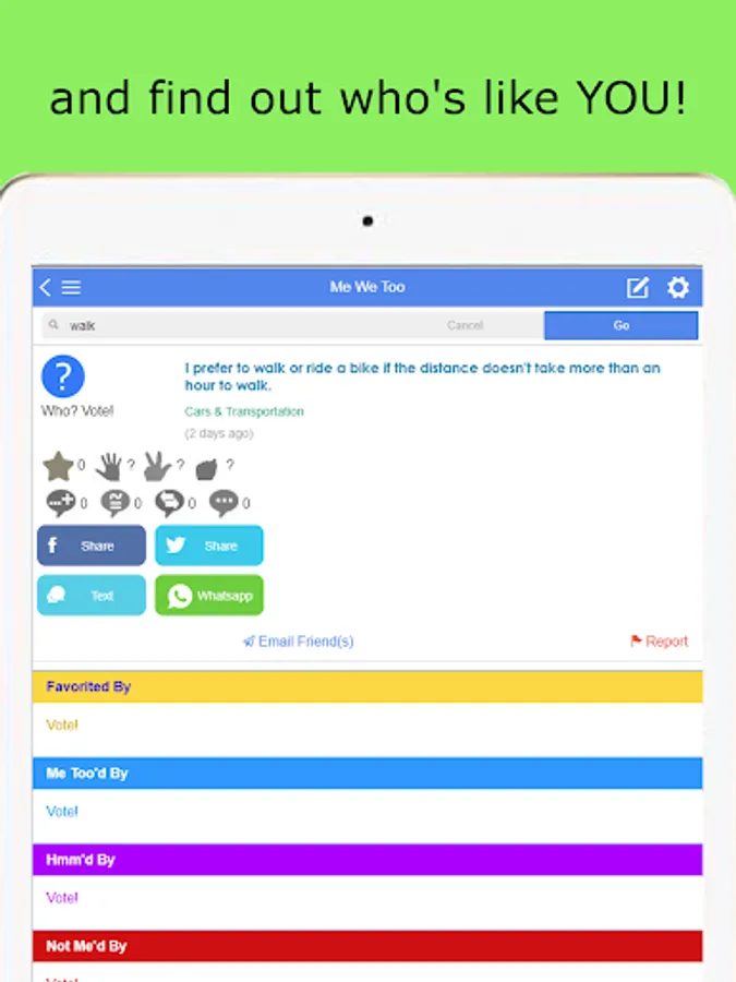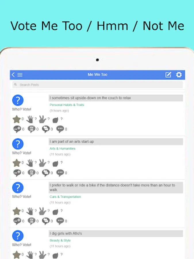 Share who you are through mini polls and members vote “Me Too”, “Hmm”, or “Not Me” to discover who posted and voted what (usernames). Find out who's most like you via the “We Circle”. Connect with members worldwide and make new friends! #mewetoo #beyou