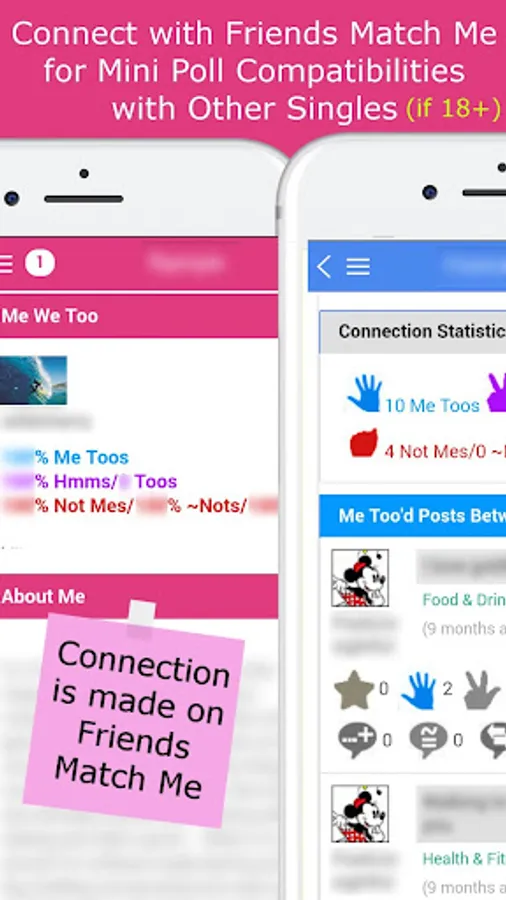 If you're 18 years or older and single, you can connect your Me We Too to the dating app Friends Match Me (connection done on Friends Match Me), to check out your mini poll compatibilites with other single members who have also connected - i.e. your Me Too's/Hmm's/Not Me's on Me We Too posts. Choose on your Me We Too Edit Profile page to also show your Friends Match Me profile/link on your Me We Too profile.