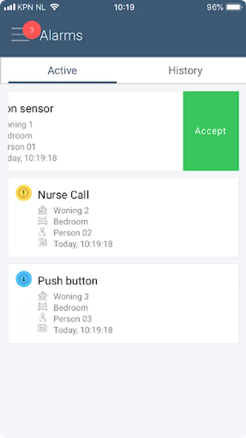 If an alarmcall is missed because, for example, if the user is on the phone. The user can see in the history tab what alarm he missed and who handled the alarm. The VieProApp is a reliable app that so no alarm messages will be lost. The app is simple and convenient to use.