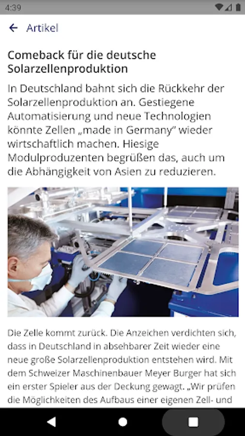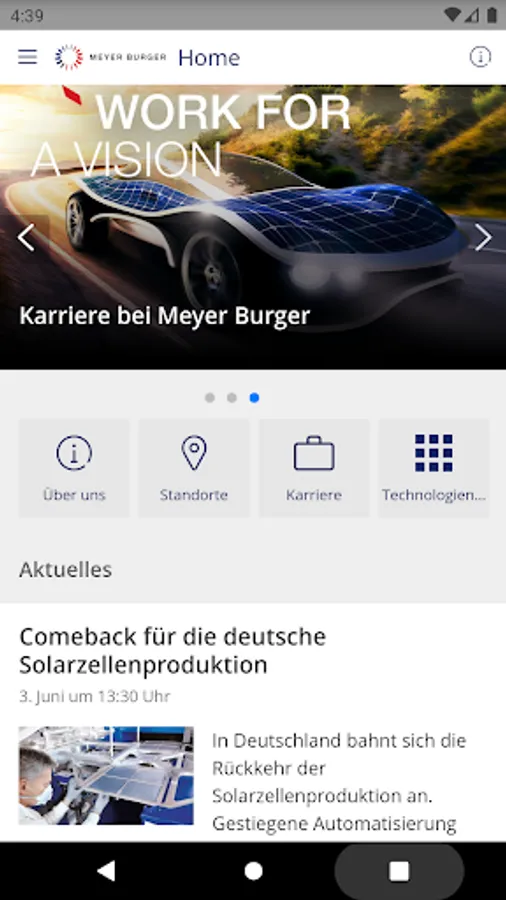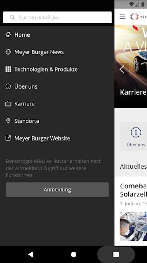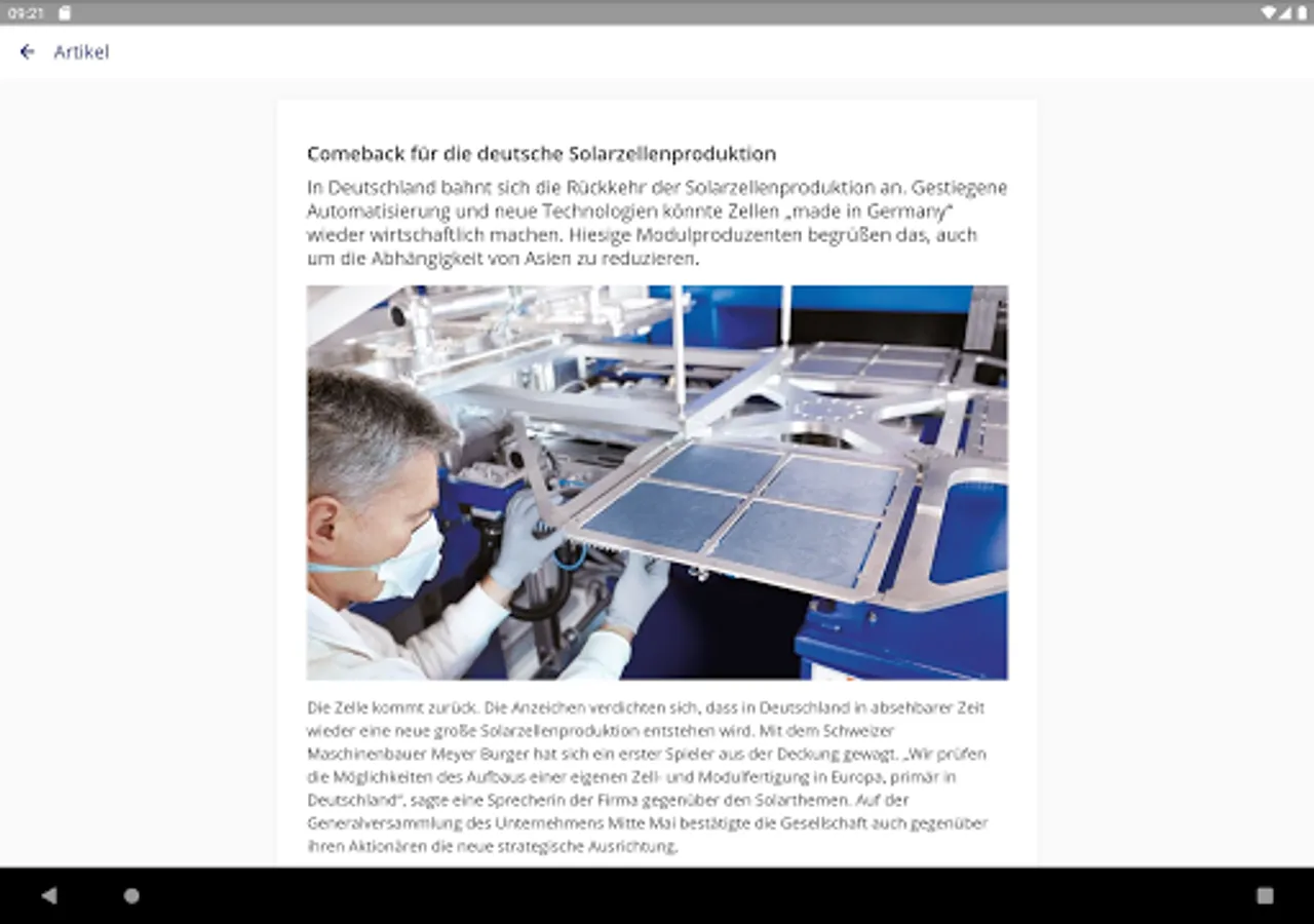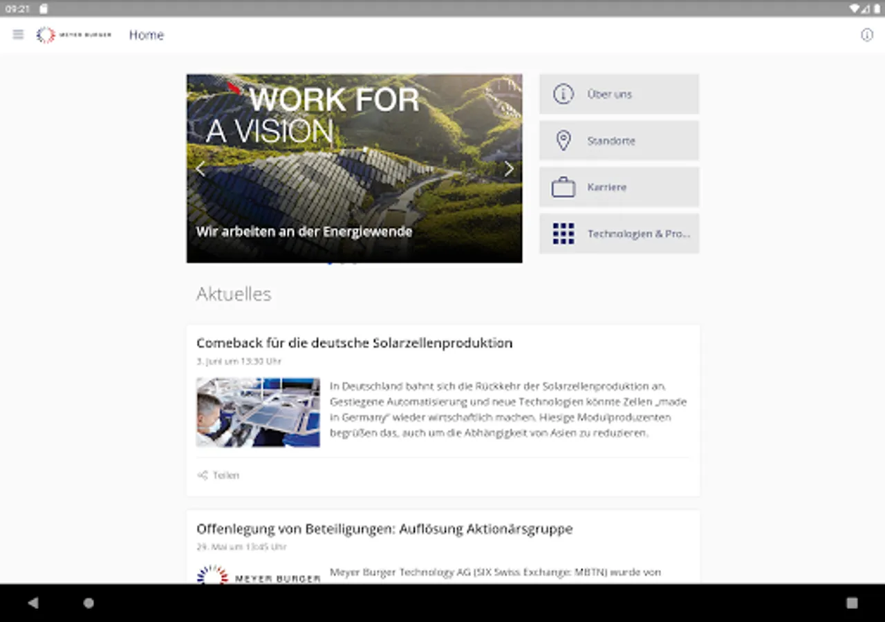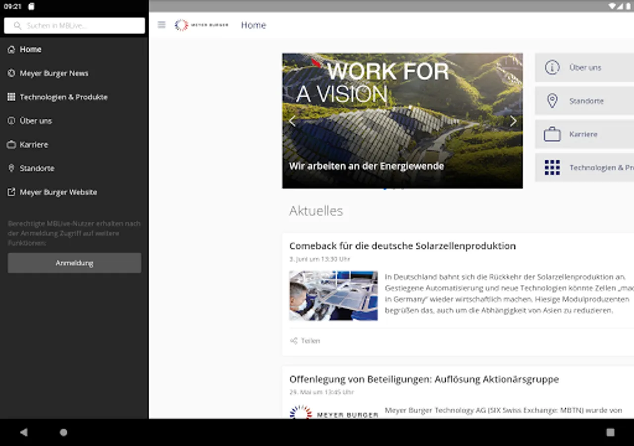 • News: stay up to date with the latest news. With push notifications, you can immediately see what's exciting in the world of Meyer Burger Technology.