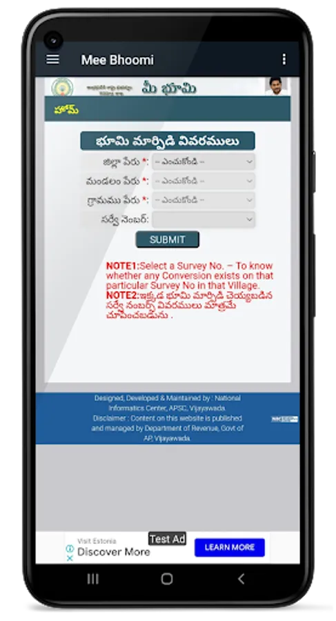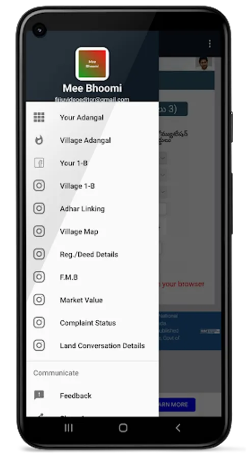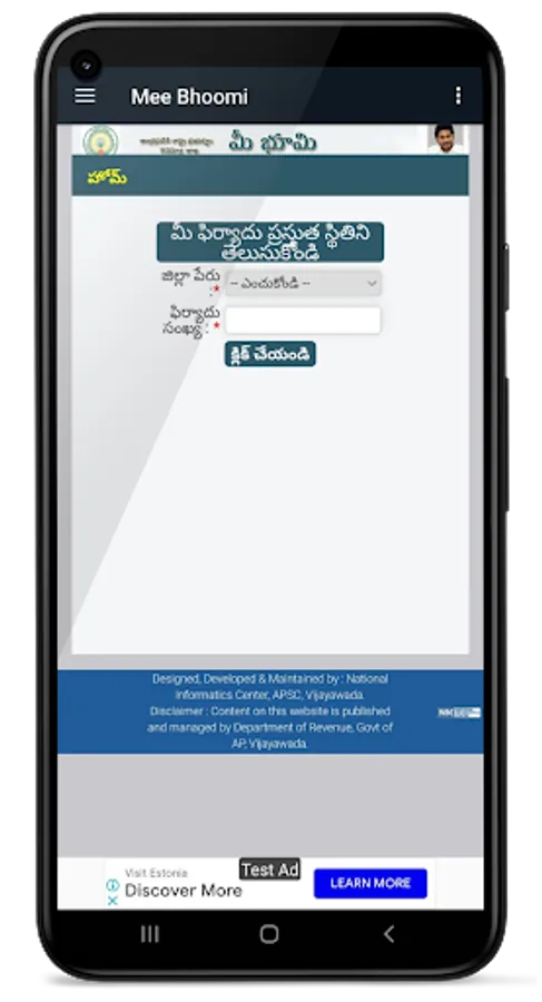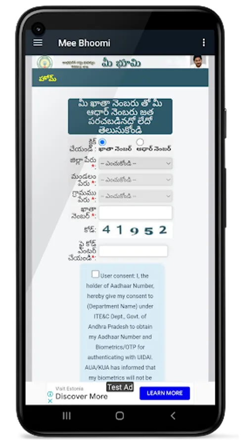 Mee-Bhoomi is a land records portal started by the Revenue Department of Andhra Pradesh. It allows visitors to find information on land, including ownership details. The App is in the Telugu language. The purpose of Mee-Bhoomi is that the people of Andhra Pradesh can easily see their land records.