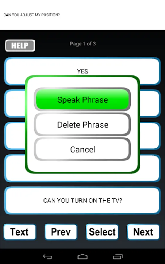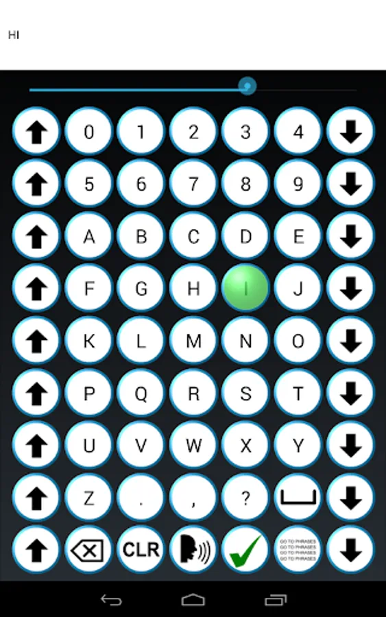 This app gives the user the ability to type words and select phrases by blinking. It has an easy to use interface, and does not require knowledge of Morse Code, or any other code schemes. Once a phrase is "blink-typed" or "blink-selected", the user can blink on a command to have the mobile device speak the phrase via the mobile device's audio speaker.