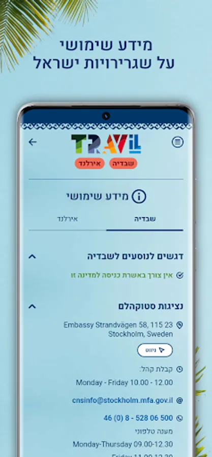 The TravIL application was developed by the Ministry of Foreign Affairs in order to make it easier for Israeli citizens traveling to different countries in the world. The application is based on advanced digital tools, works even without connecting the device to the network (important in areas without reception) and preserves your privacy - without the requirement to register personal details or track the geographic location of the device.