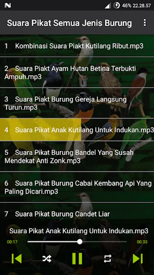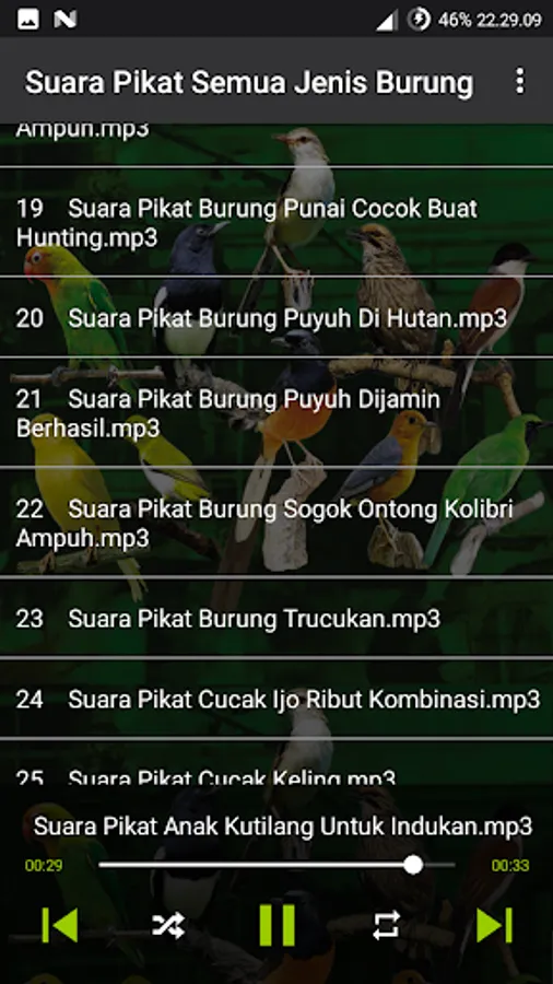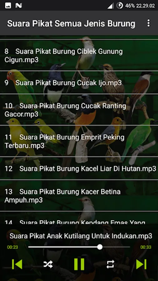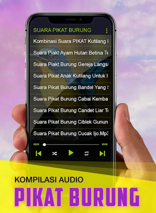 This application also has the most complete variety of alluring sounds of birds such as Lovebirds, Murai Batu, Anis Merah, Anis Kembang, Kutilang, Partridge, Church, Ciblek, and many more. With a long duration and a complete variety of luring sounds, you no longer need to download many applications to attract birds. Just this one application, all the charming sounds you need are provided.