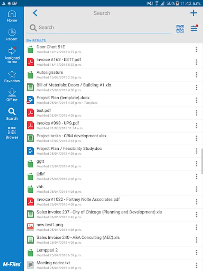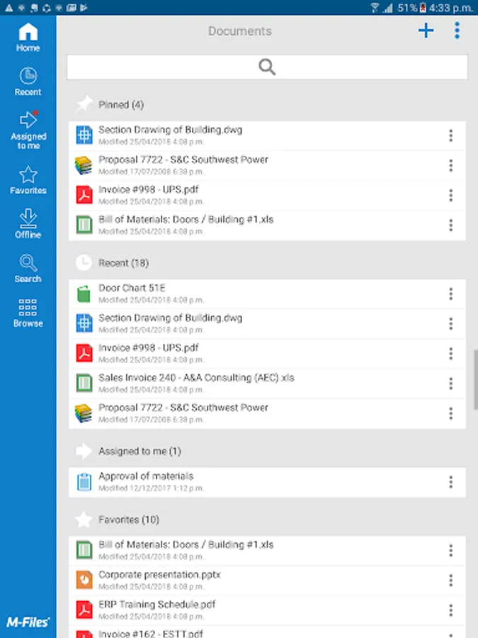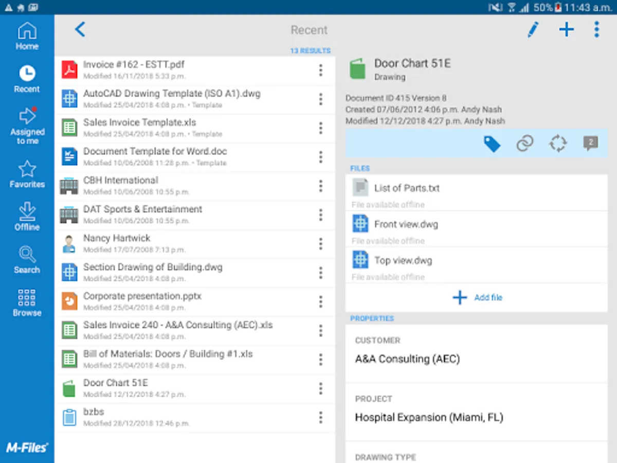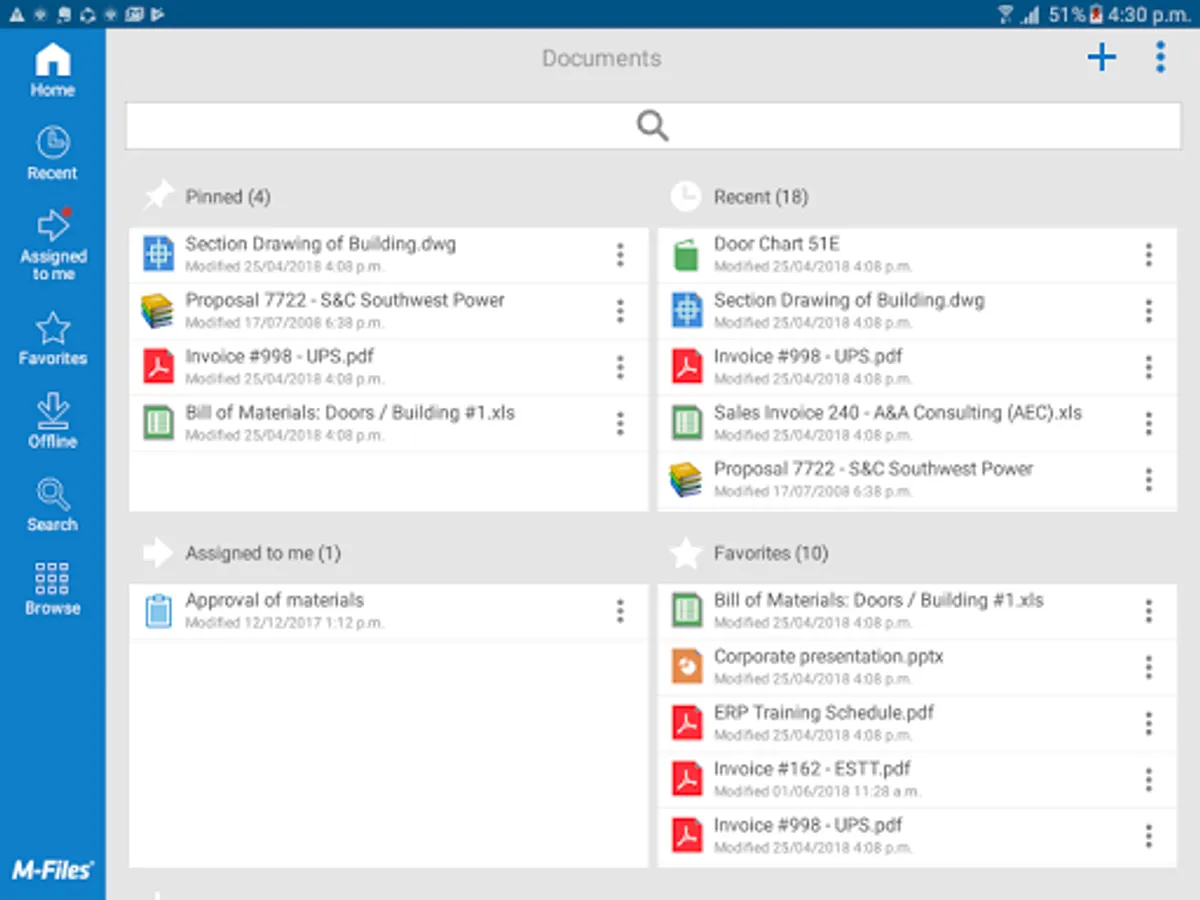 The M-Files Android application lets you access your M-Files documents anytime and anywhere – even when you’re on the go or not connected to your office network. The application enables you to find documents from your M-Files Vaults via powerful search functions and various, customizable views, as well as to view and approve documents and workflows.