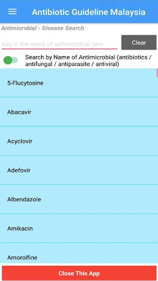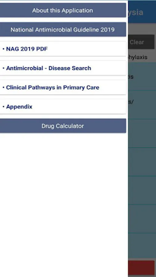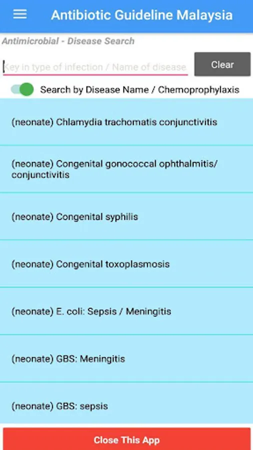 This application helps healthcare professionals to search through National Antimicrobial Guideline 2019 with ease, using keywords from disease name as well as generic drug names of antimicrobial