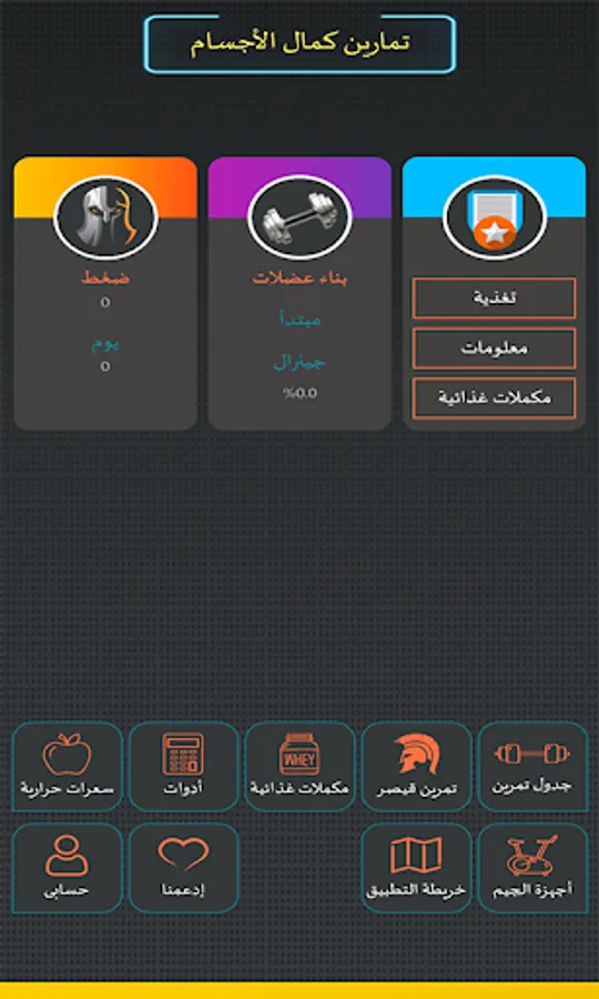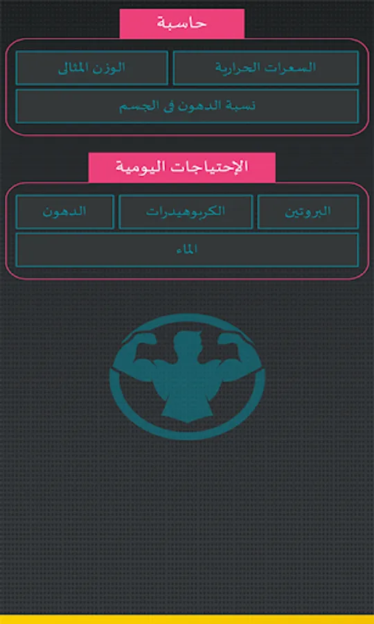 It contains important and necessary computers for the bodybuilding player to challenge calories, ideal weight, body fat percentage, daily needs of protein, carbohydrates, fats and water.