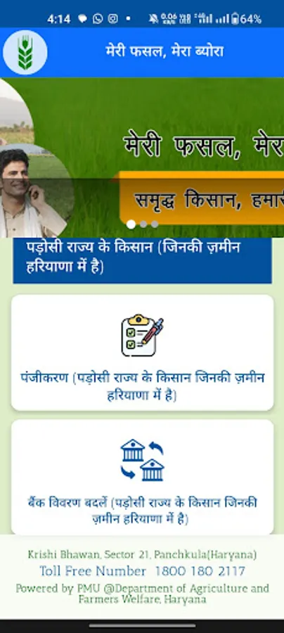 Meri Fasal Mera Byora (MFMB) is a flagship scheme/programme of state Government wherein farmers register themselves to sell their crops on MSP and to get other benefits of Agriculture and other allied Departments. Now this portal has become an Umbrella platform for almost all benefits including MPMV (Mera Pani Meri Virasat), Direct Seeded Rice, Bajra Replacement and BhawantarBharpaiYojana, Uttam Beej (Seed Development) etc.