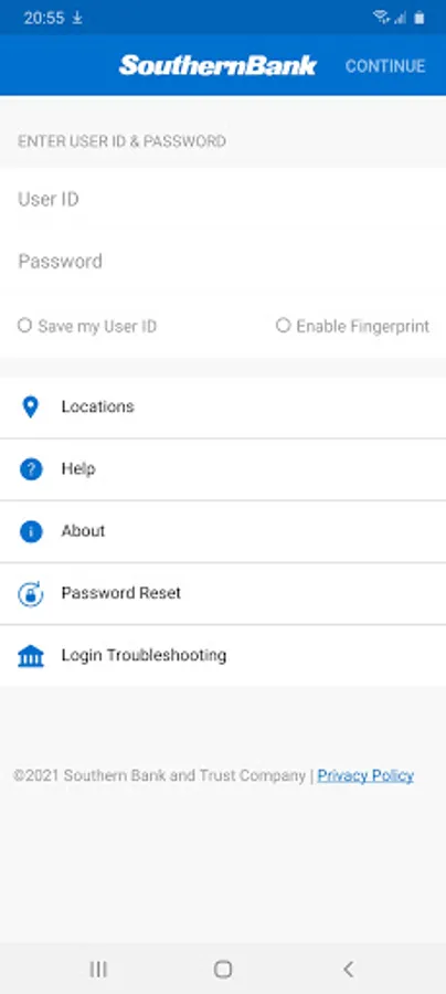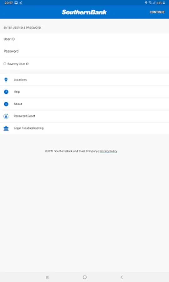 Before launching the app, make sure you have a personal online banking profile at https://www.southernbank.com/personal/mobile. This will sync all your data and keep your accounts up to date.