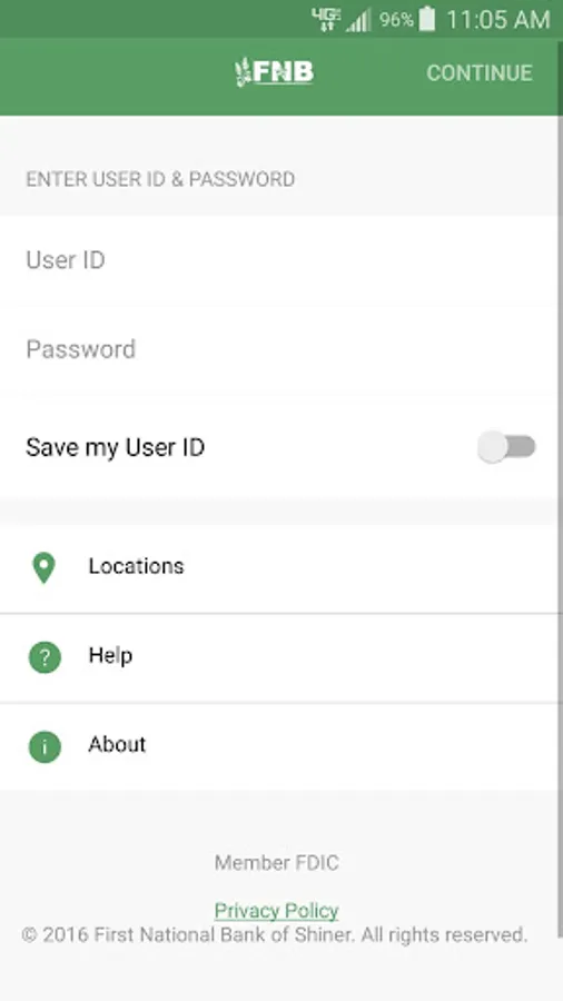 Start banking wherever you are with FNB Shiner Mobile for Android! Available to all First National Bank of Shiner Mobile Banking end users. FNB Shiner Mobile allows you to check balances, pay bills, make transfers, and find locations. Need to find a branch or ATM closest to you? With Find Near Me, FNB Shiner Mobile will discover your location and provide you with addresses and phone numbers on the fly.