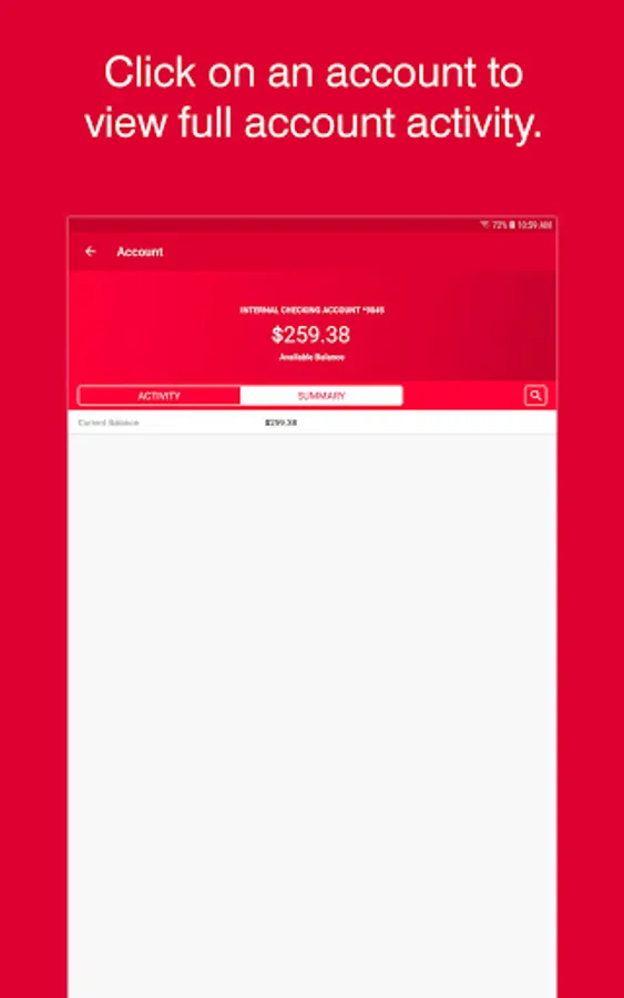 - Check your latest account balance and search recent transactions by date, amount, or check number.