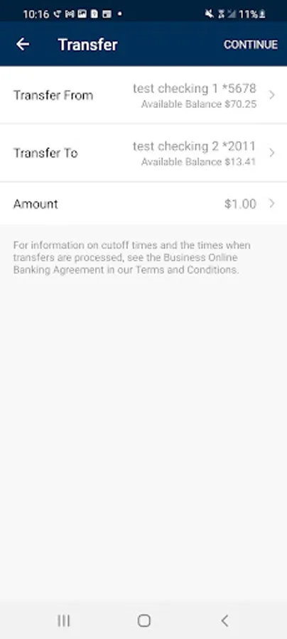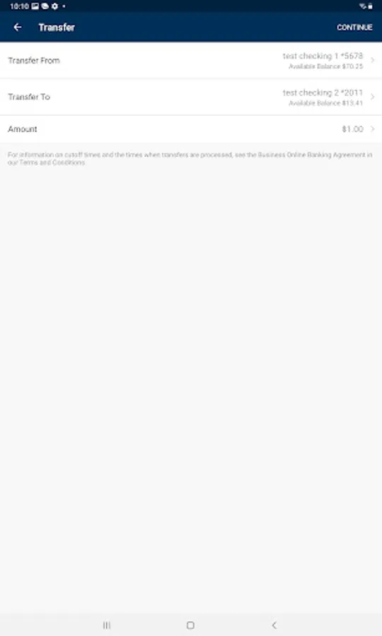 Business allows you to check balances, make transfers, pay bills, make deposits and find locations.