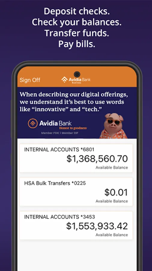 Available to all Avidia Bank business online banking customers. Avidia Business Mobile allows you to check balances, make transfers and make deposits. Enjoy the convenience of Avidia Business Mobile!