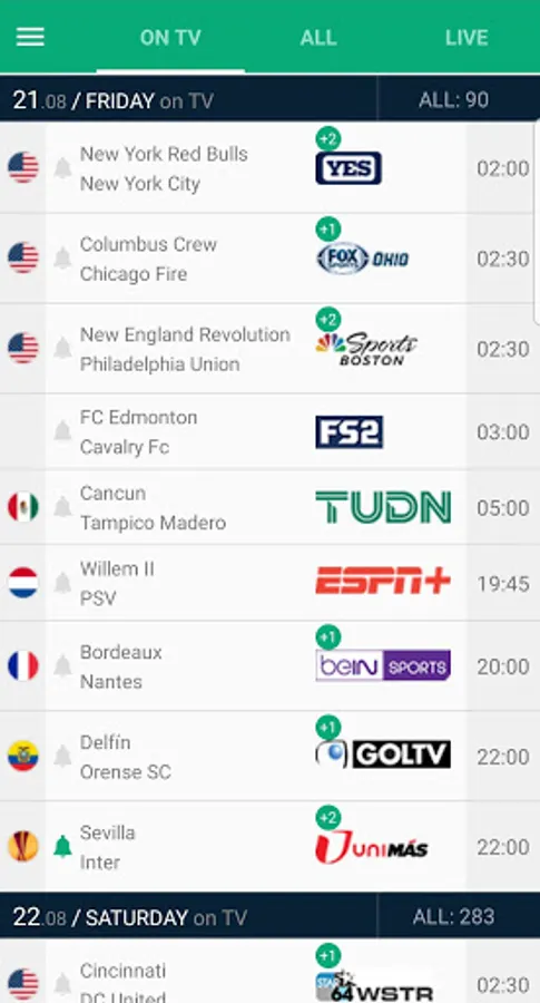 Don't miss any game any more. See the full TV schedule of the live soccer games on local tv channels.