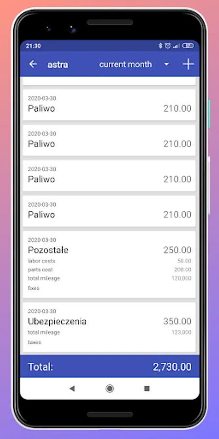 Calculator fuel combustion has the capability of storing individual refueling and presents the results on the basis of the following entries. We can view the individual entries, fuel prices,