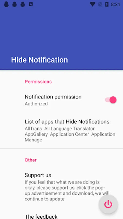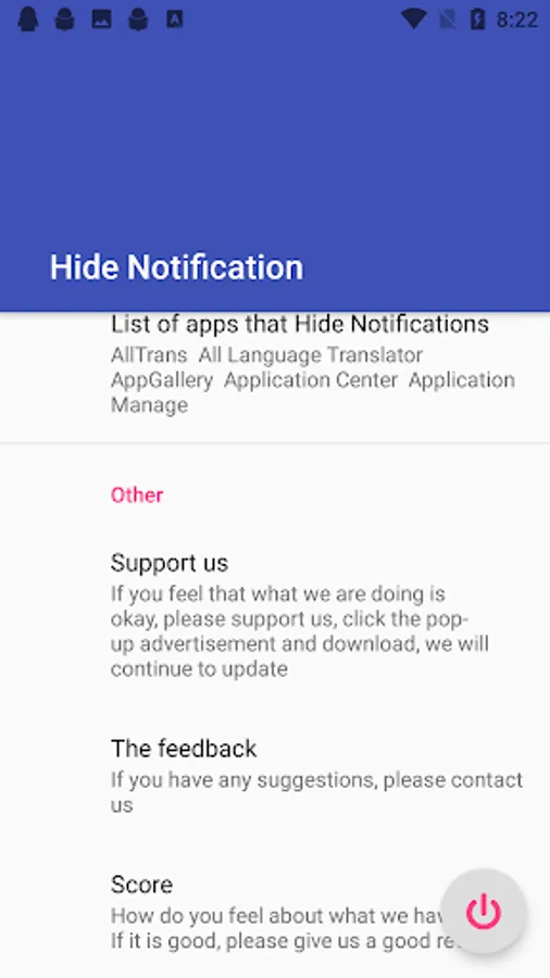 Hidden notification can delete notification annoying annoying notice, and you can choose according to your needs that the application of the notice can be retained, in addition to the system after Android 8.0 can remove any notice, including running, and some can not be deleted before Notice, in general it is a great software, I hope you can like ^ _ ^^ _ ^^ _ ^
