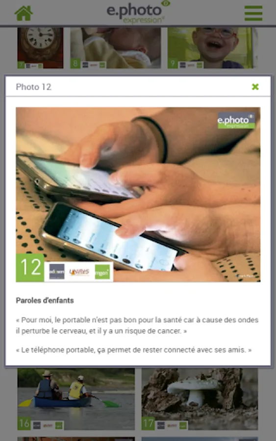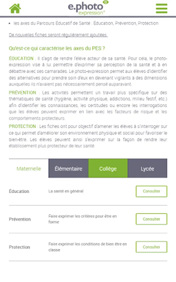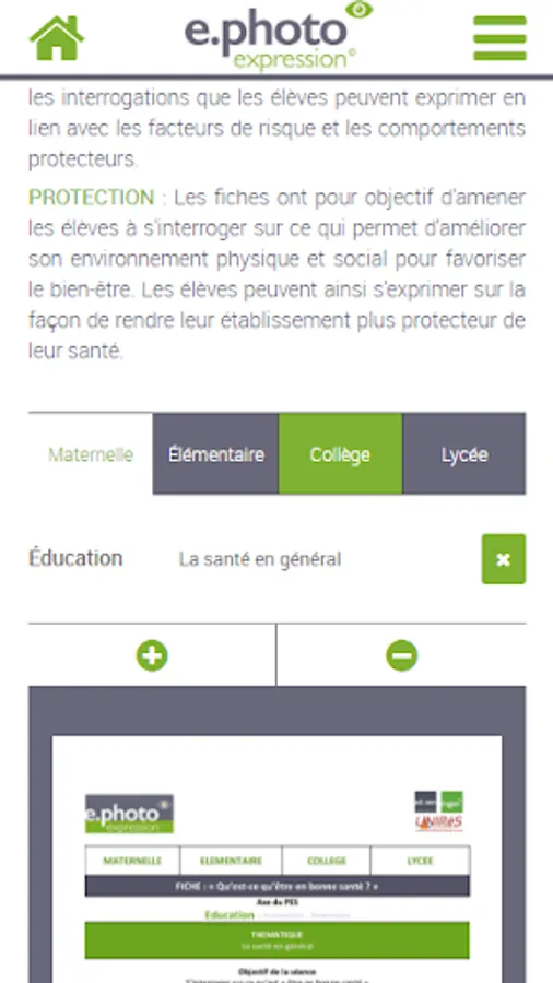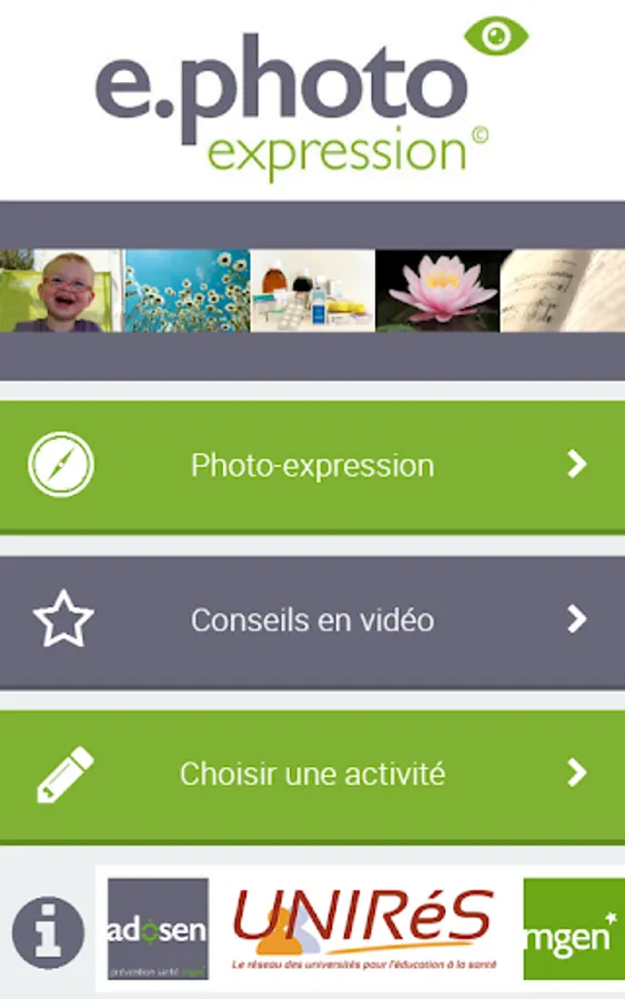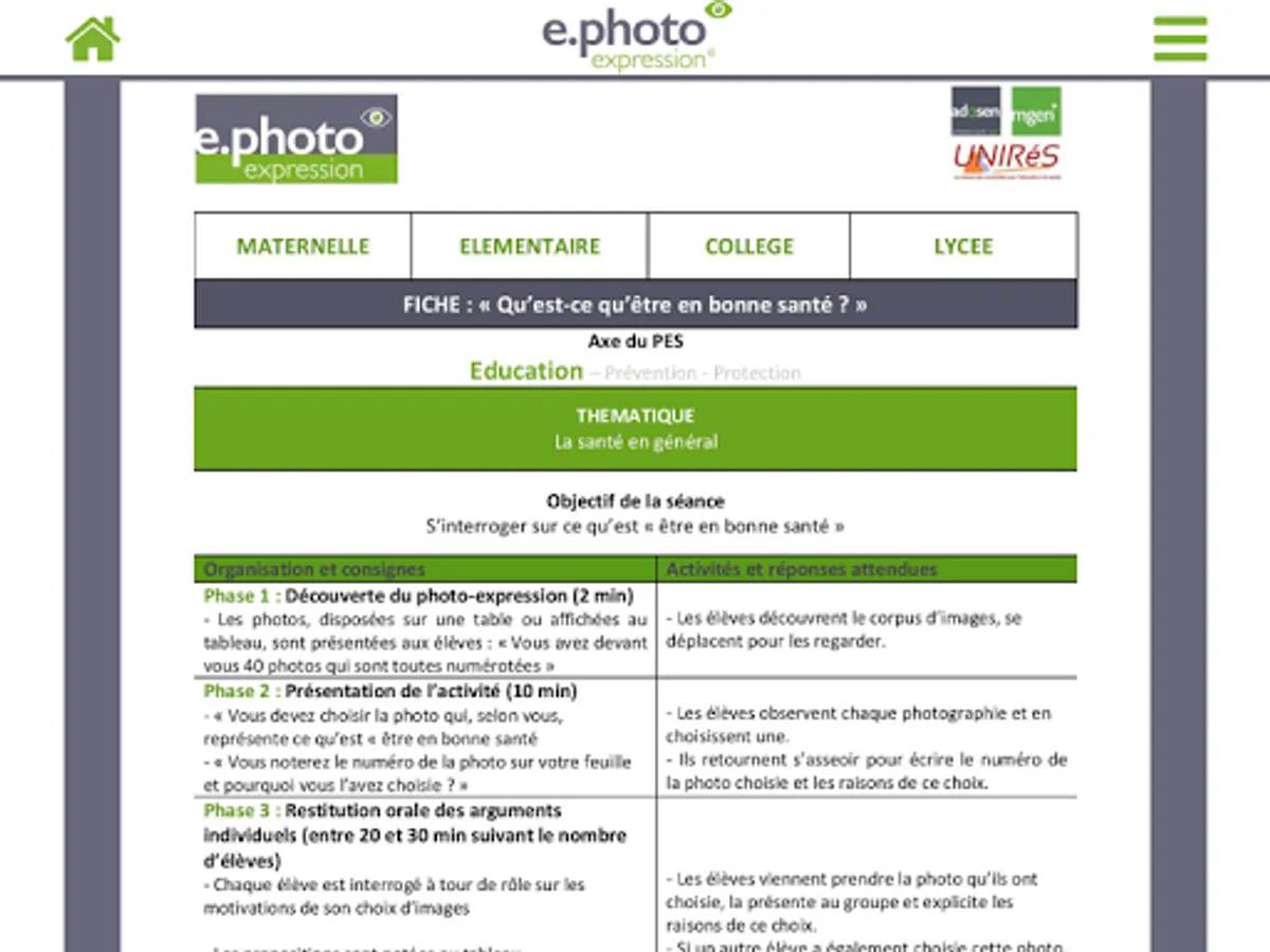 The application offers ephotoexpression, from a corpus of 40 photographs, activities with children and adolescents (kindergarten, elementary, middle, high school) around health and health issues. This application offers video tutorials for implementation in class of "bonus" to download photographs, examples of children with the words recceuillies Photoexpression and teaching notes by level of education.