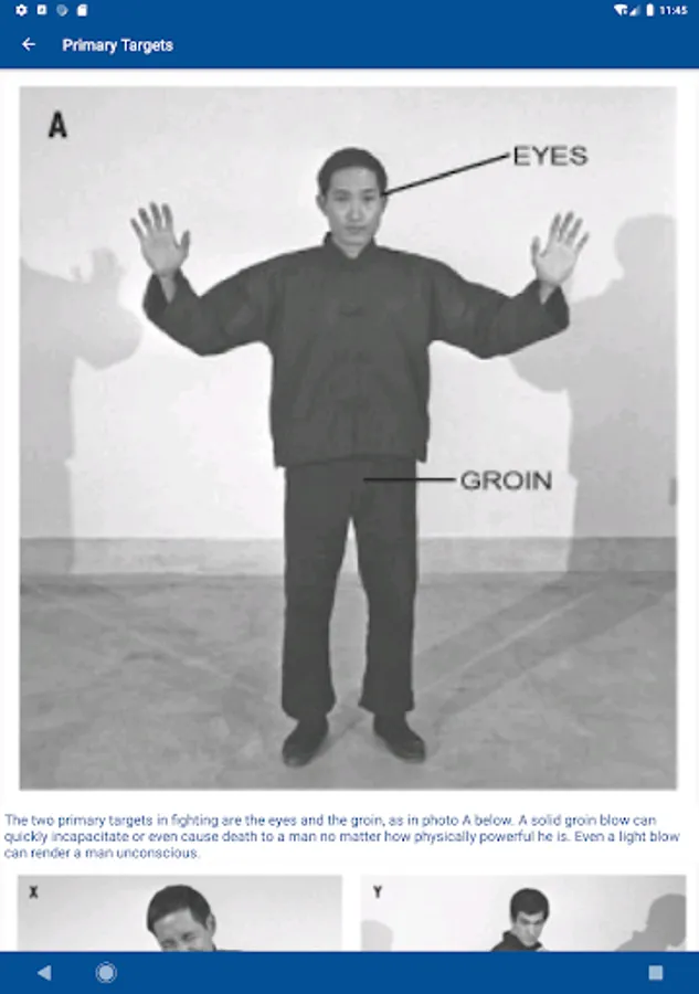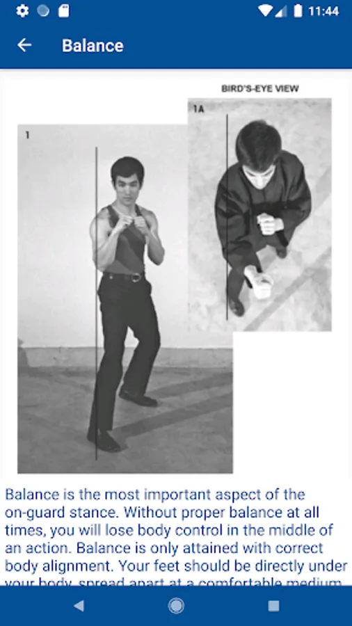 This App comprises of legendary fighter Bruce Lee's demonstration on simple, effective methods for dodging and deflecting incoming blows. It teaches you on how to develop skills in body movement, hand techniques, kicking, parrying, striking vital target points and sparring. Skill in technique is very important in the art of fighting.