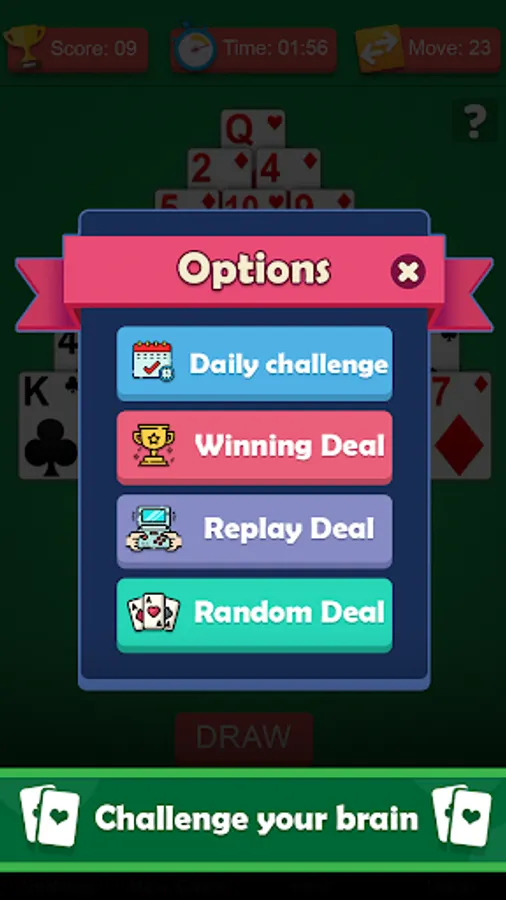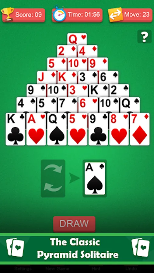 Always FREE - Play unlimited classic deal every day! Pyramid Solitaire is a fun puzzles that anyone can enjoy! If you like brain puzzles, Pyramid Solitaire card games is sure to be a hit in town !