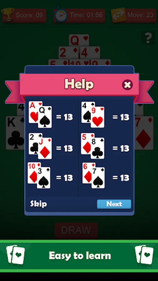 Pair two uncovered cards that add up to 13 to clear them. Drag and drop to move cards and make Pair that equal to thirteen. Simple math games. Aces are equals to 1 point, Jacks = 11, Queens = 12, and King is 13 (thirteen) Now, you can play more and get addicted, don't forget to challenge yourself by playing daily challenges.
