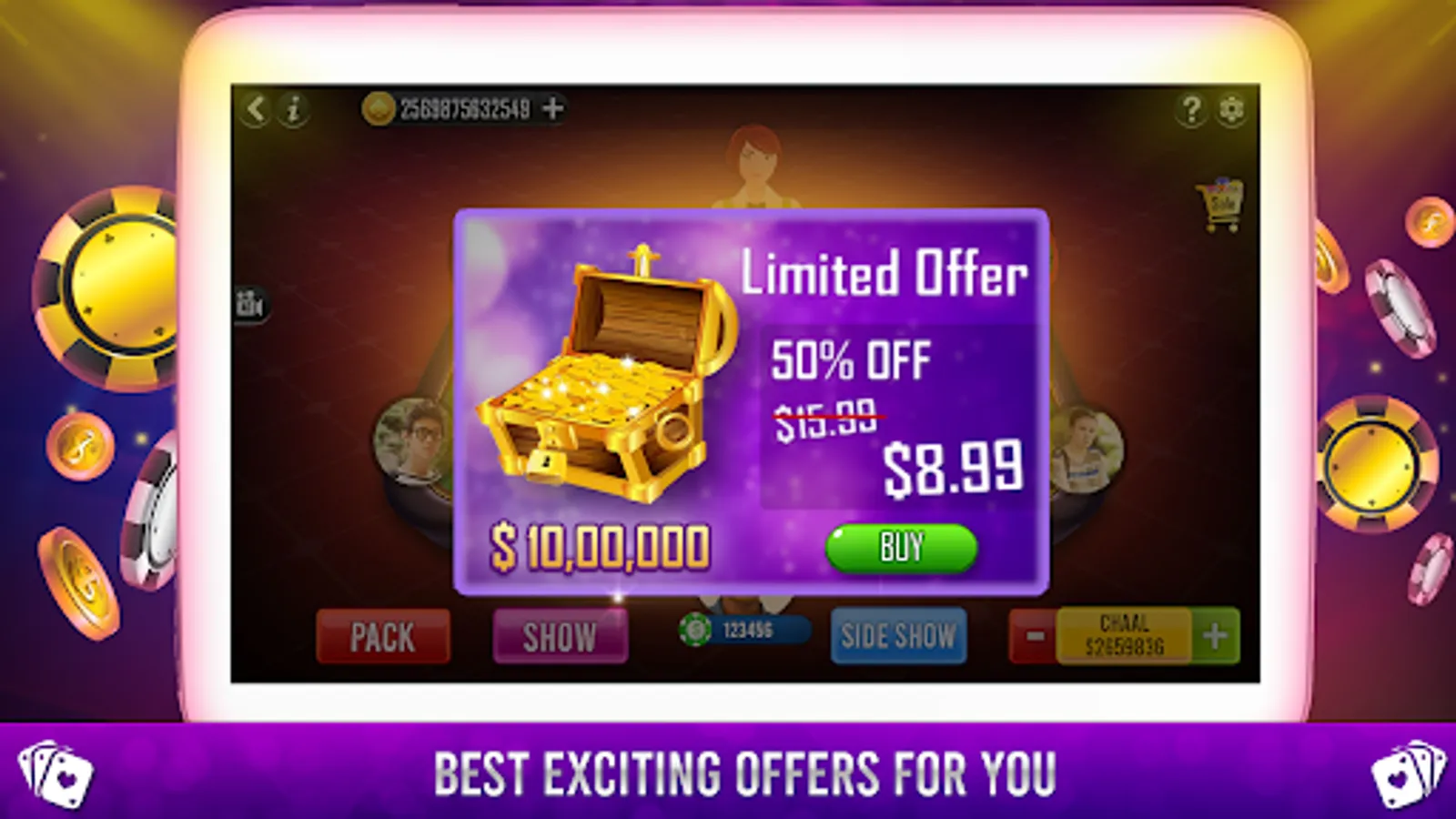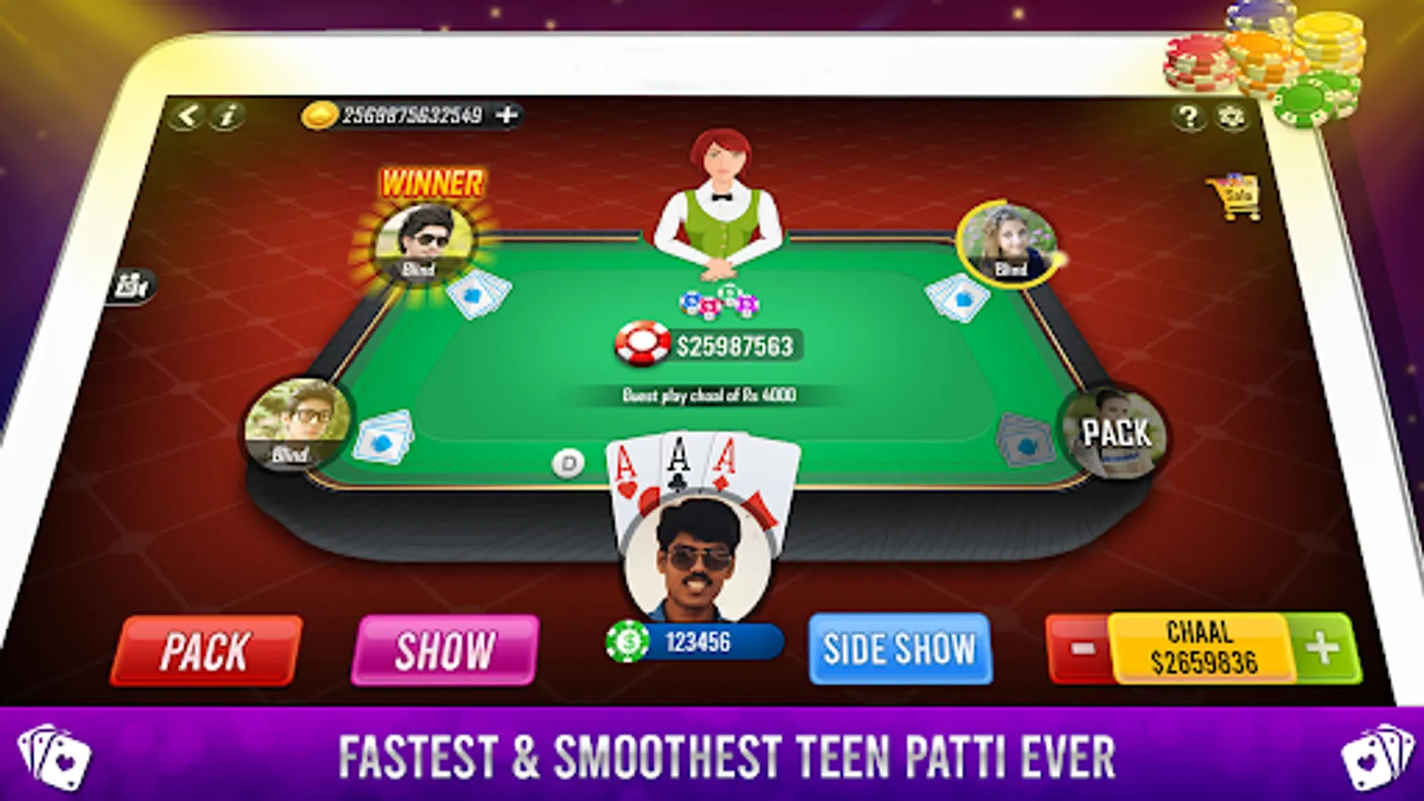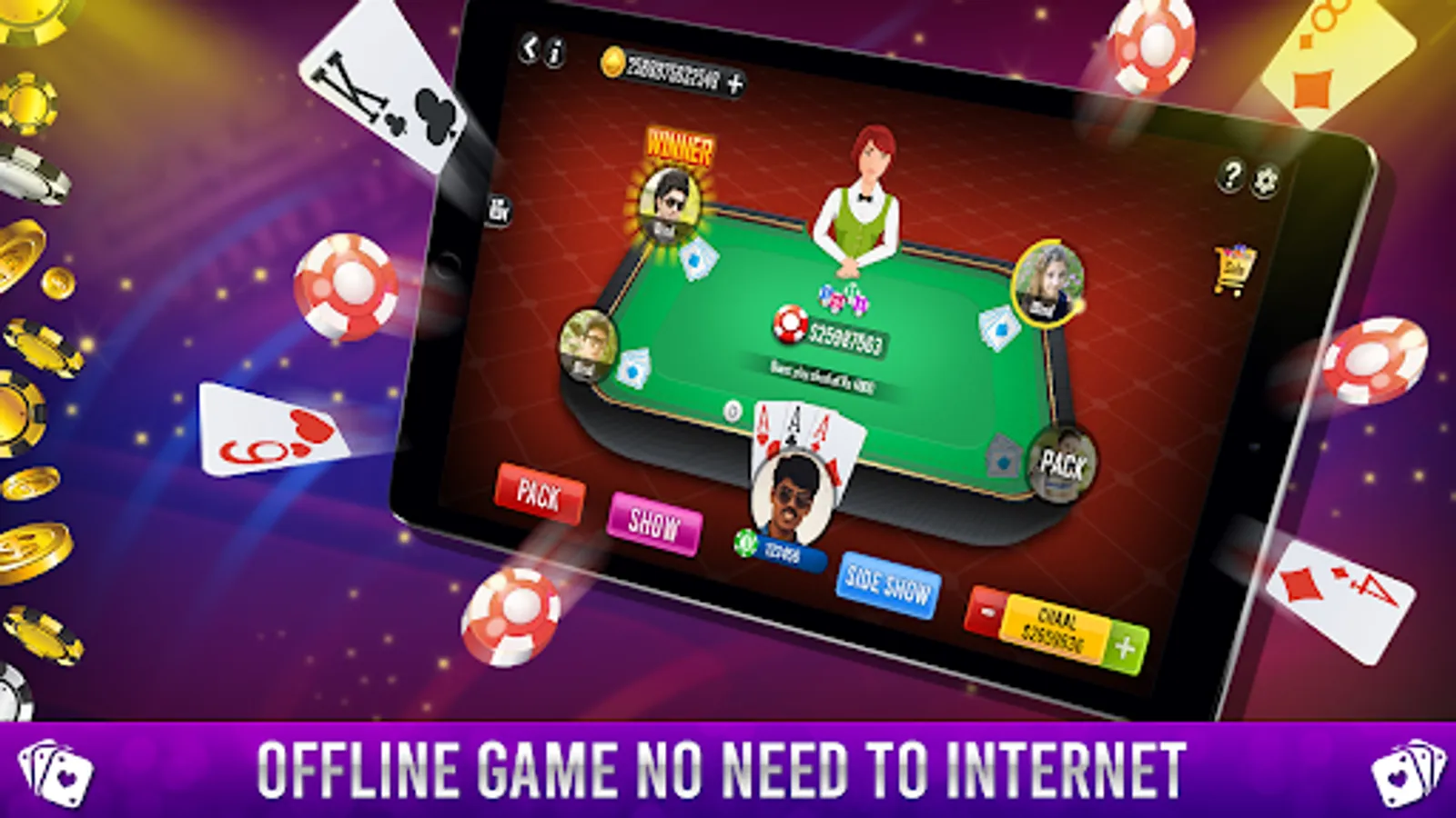 Few variation like hukum card, muflis,lowest joker added in this brag card games. Its best 3 card game popular in India and UAE. I can say its original game of 3 pati as there is no hidden feature , try your luck, be lucky and win the game.