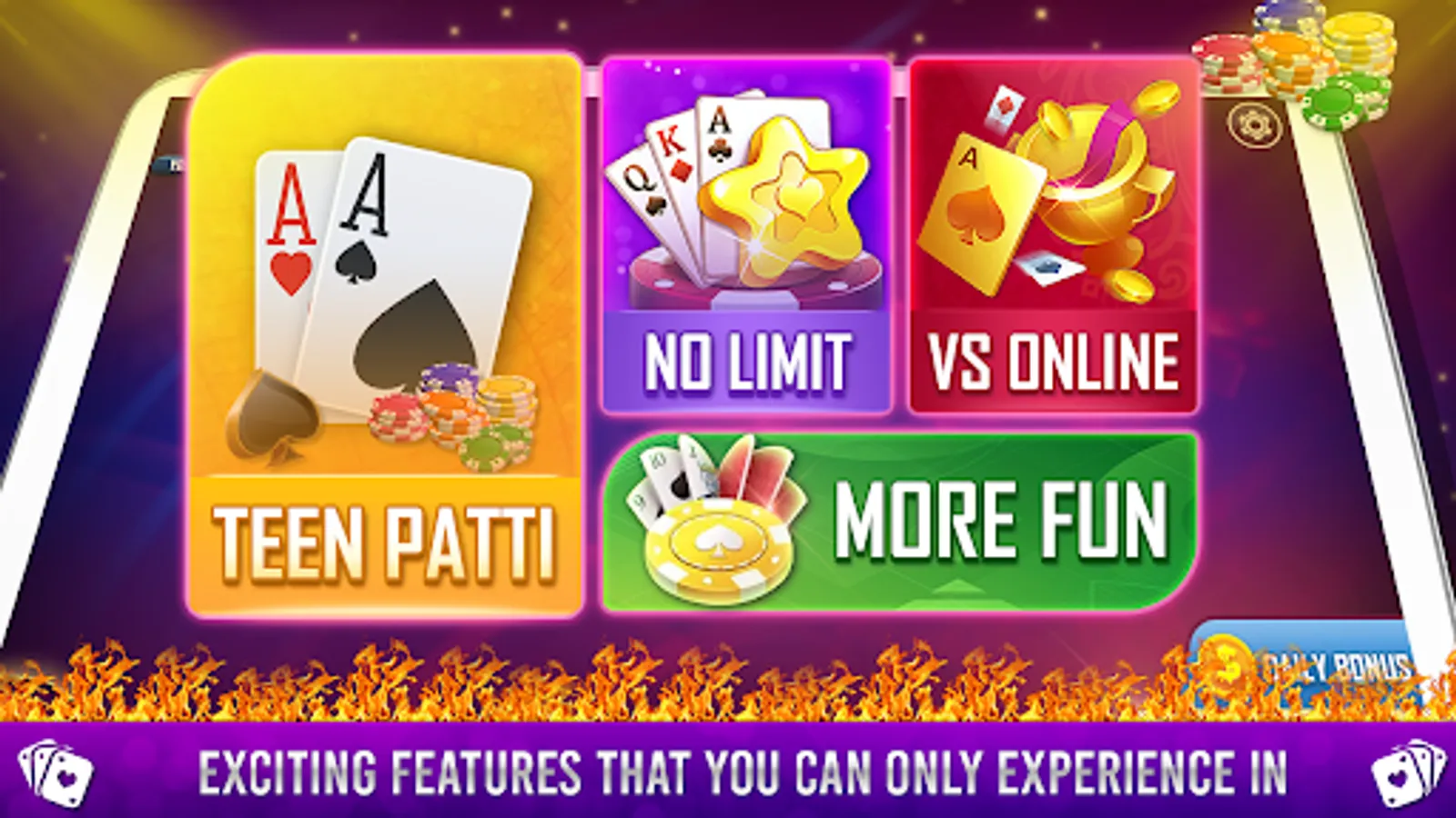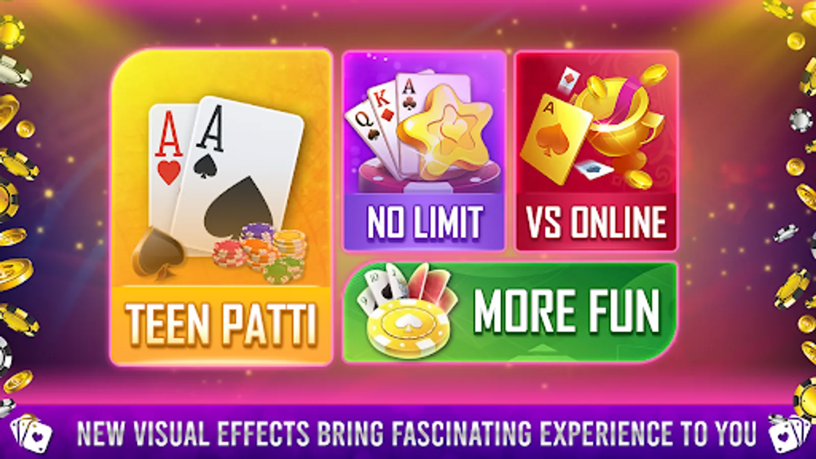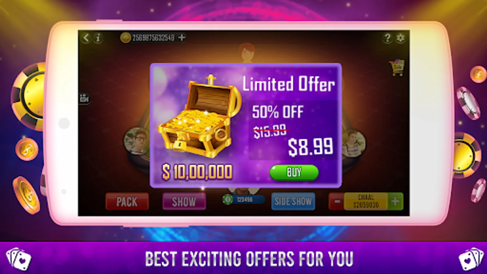 Few variation like hukum card, muflis,lowest joker added in this brag card games. Its best 3 card game popular in India and UAE. I can say its original game of 3 pati as there is no hidden feature , try your luck, be lucky and win the game.