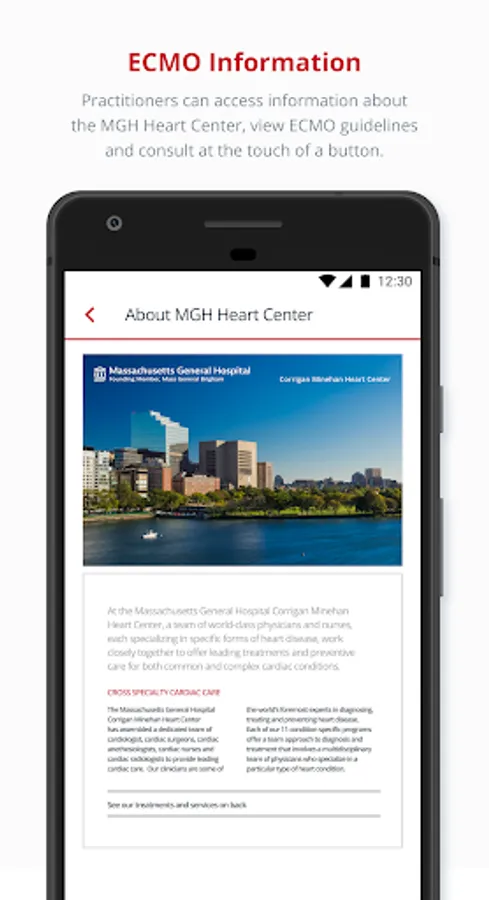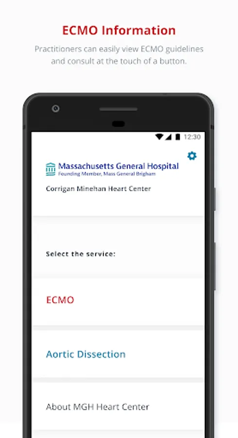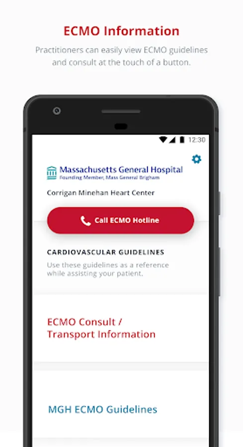 This App provides guidelines from the Massachusetts General Hospital (MGH) for clinical care of patients requiring extracorporeal membrane oxygenation (ECMO) or suffering from Aortic Dissection. The App also provides one-touch telephone access to the appropriate MGH physicians on call for assistance with these patients. Primary physicians and first-responders can use the App to refer patients directly to the MGH Heart Center for life-saving emergency care.